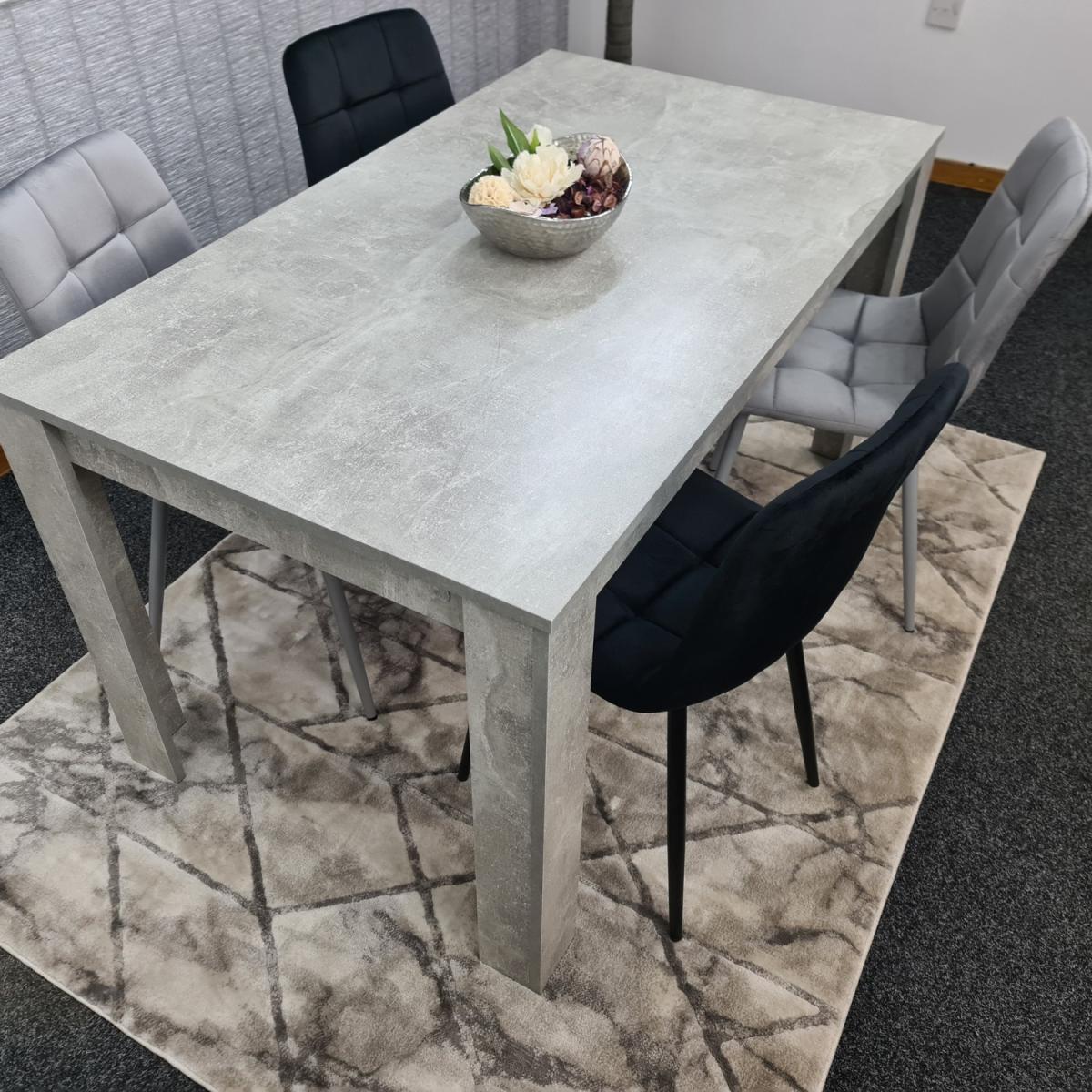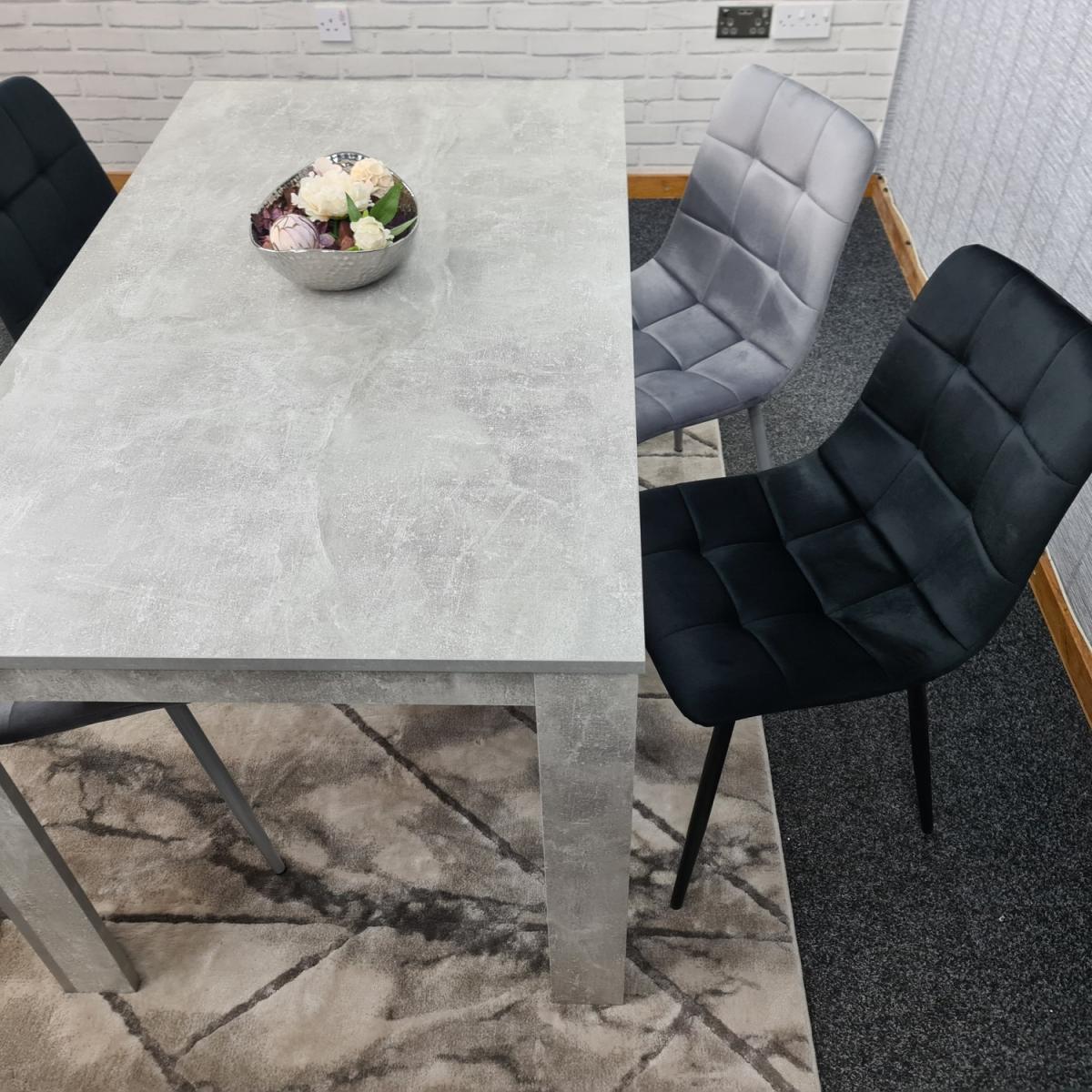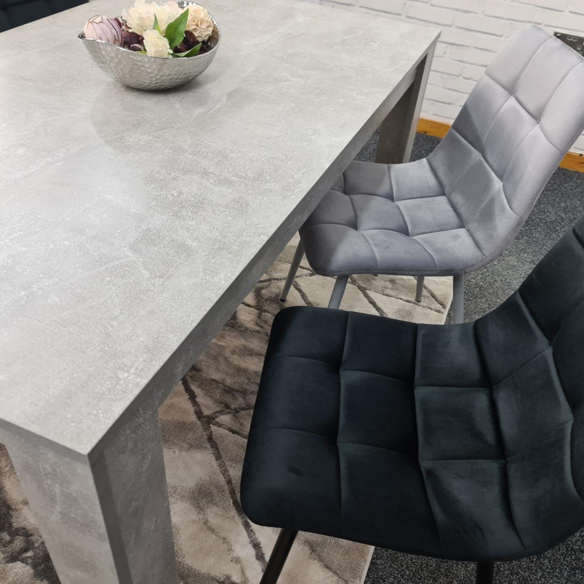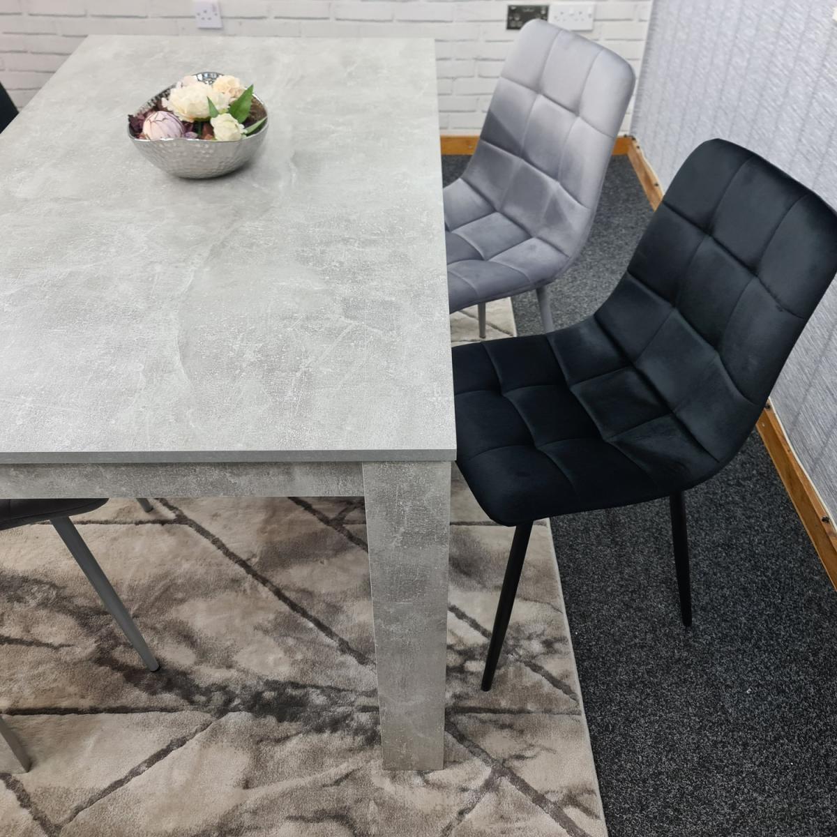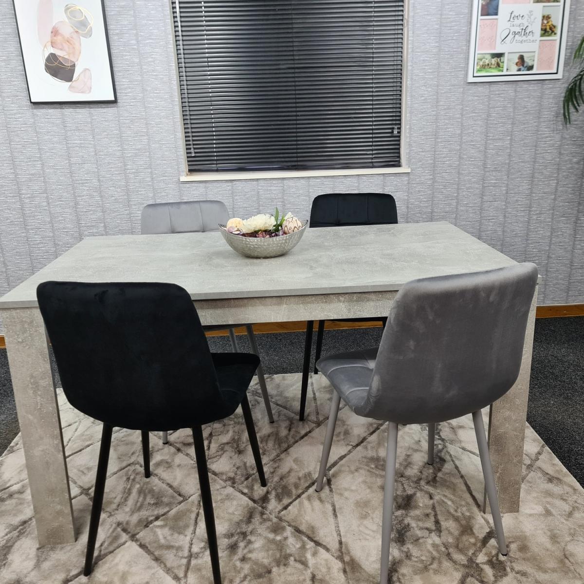Transform & brighten your dining area with this stunning, contemporary dining table with 2 grey and 2 black velvet mixed chairs. Stone Grey Table with 4 Mixed Velvet Metal Chairs. The chairs are of a modern design, transforming your dining room and looking so spectacular and unique. The table is made from wood and has a melamine laminated light stone grey effect. The item comes flat-packed and requires some home assembly. The high-quality velvet chairs give a premium look and ultra-smooth feel. A slightly curved shape is more comfortable to sit on, and with lots of padding. Armless design to give a chic look and bring a modern elegance to your home dining room.