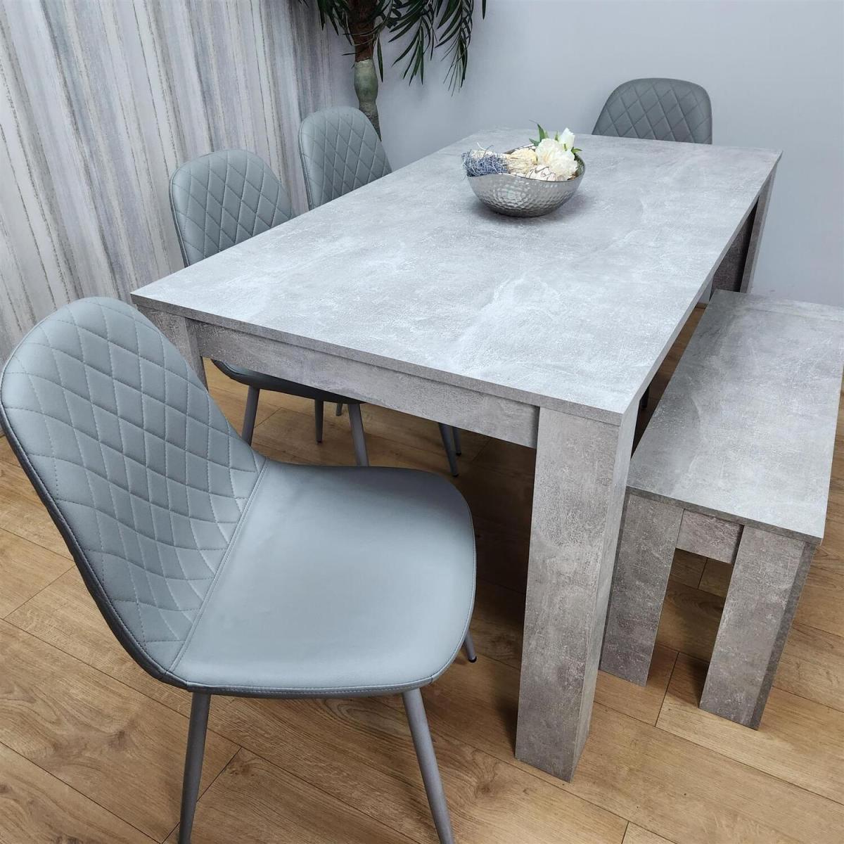 Introducing our elegant dining set that effortlessly combines style and functionality. The rectangular dining table is crafted from high-quality MDF, ensuring durability and longevity. The table is made from MDF wood and has a melamine laminated light stone grey effect. Transforming your dining room and looks so spectacular and unique. The item comes flat-packed and requires some home assembly. The sturdy grey chairs and metal legs provide reliable support, and their adjustable feet ensure stability, even on uneven surfaces. Completing the set is a matching stone-grey effect bench, measuring 90 cm (Length) x 30 cm (Width) x 45 cm (Height), offering extra seating space with a coordinated look.