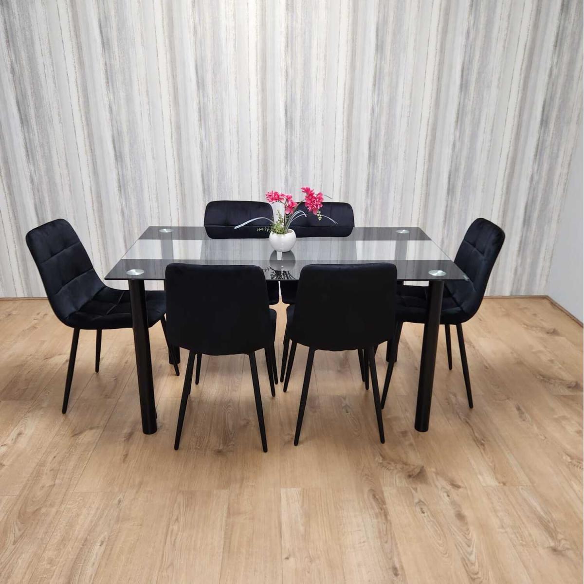 A Stunning clear glass with a beautiful black double-striped design Dining Table set includes set of 6 tufted velvet black rocco chairs with slightly curved back design. The dining table colour is clear with black double-striped design. The dining chairs colours are black with slightly curved back design for fitting with body shape. The dinner table is crafted with 8mm high-quality tempered glass with metal legs to ensure a durable, long-lasting tabletop. The dining chairs are made of premium velvet with metal chair legs. The seat height of the chair is 45 cm. Straight forward assembly is supported by clear instructions for our dining table set. Legs prevent damage with the adjustable foot protection provided. The seat height of these chairs is 45 cm. Chair Dimension: 44(W) x 59(D) x 87(H)cm. Convenient format with instructions for easy assembly.
