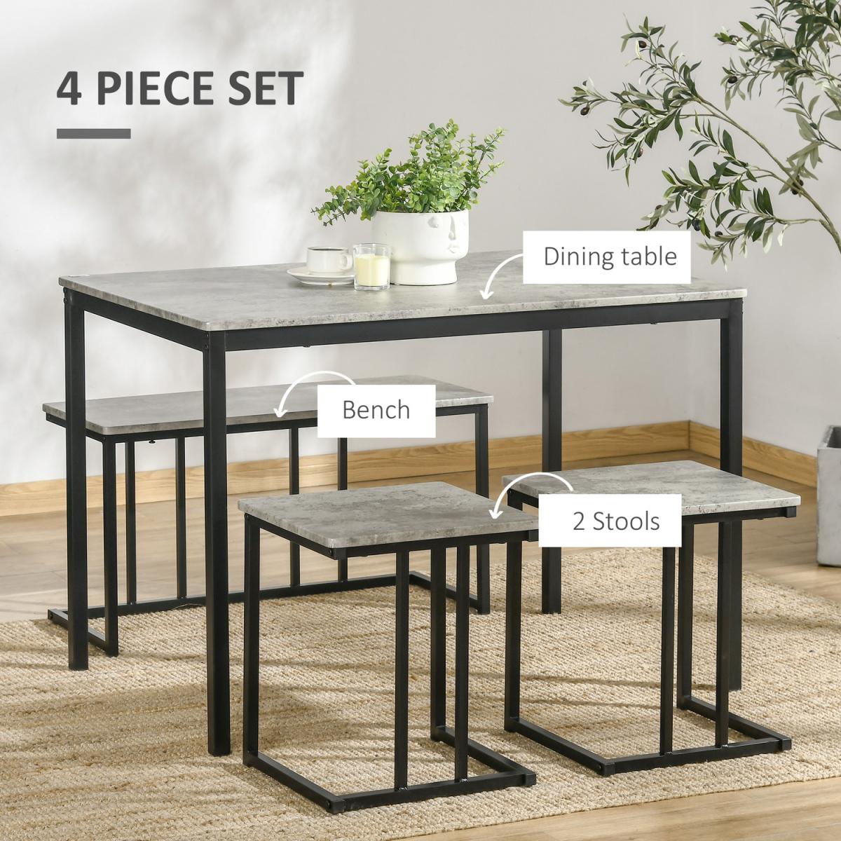 Modern dining room set comes with a dining table, two stools and two-seater bench - a must for dining and catching up with your family/friends. Metal frames mean each piece is strong and supportive, fitted with durable seat and table tops. When done, tuck in the seats and bench under the table.