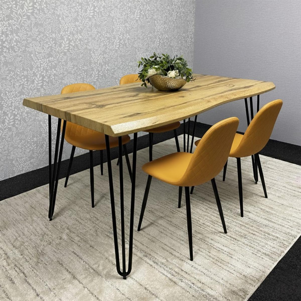 This stunning combination includes a rustic live edge wooden table paired with four stylish mustard faux leather gem patterned chairs, offering the perfect balance of comfort and contemporary design. The table is crafted from high quality engineered wood with a beautifully curved live edge top that highlights natural wood textures and tones. Supported by sleek black metal hairpin legs, it provides both strength and a modern minimalist look. The mustard chairs are upholstered in premium faux leather with diamond stitching on both the front and back, combining elegance, comfort, and durability for everyday use. Perfect for dining rooms, kitchens, cafes, and restaurants, this set brings together timeless style and practical functionality. Dimensions Table L140 W80 H75 cm Chair H85 L52 W44 cm. Seat height 44 cm