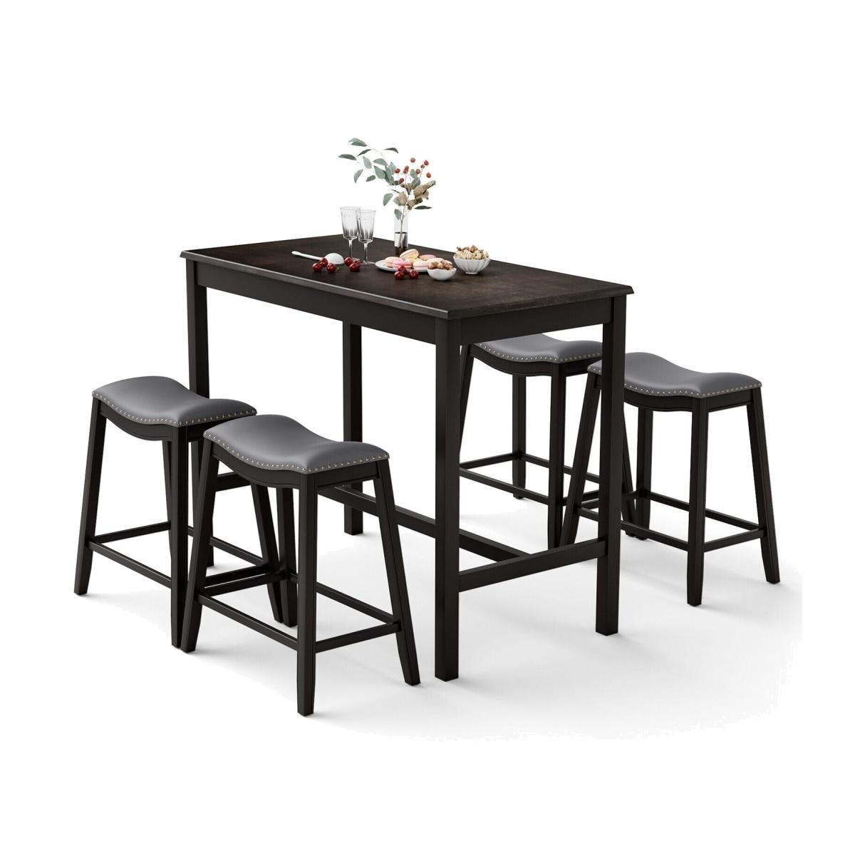 Have a wonderful time with your family with our bar table and chairs set! Our rectangular dining table features a wide tabletop that provides ample space for gatherings of multiple people. The durable solid rubber wood legs ensure a longer lifespan, and the table's I-shaped reinforced crossbar gives it a more stable structure. 4 upholstered bar stools filled with soft foam are comfortable to sit on. You can put your legs on the footrest to be in a more relaxed position.