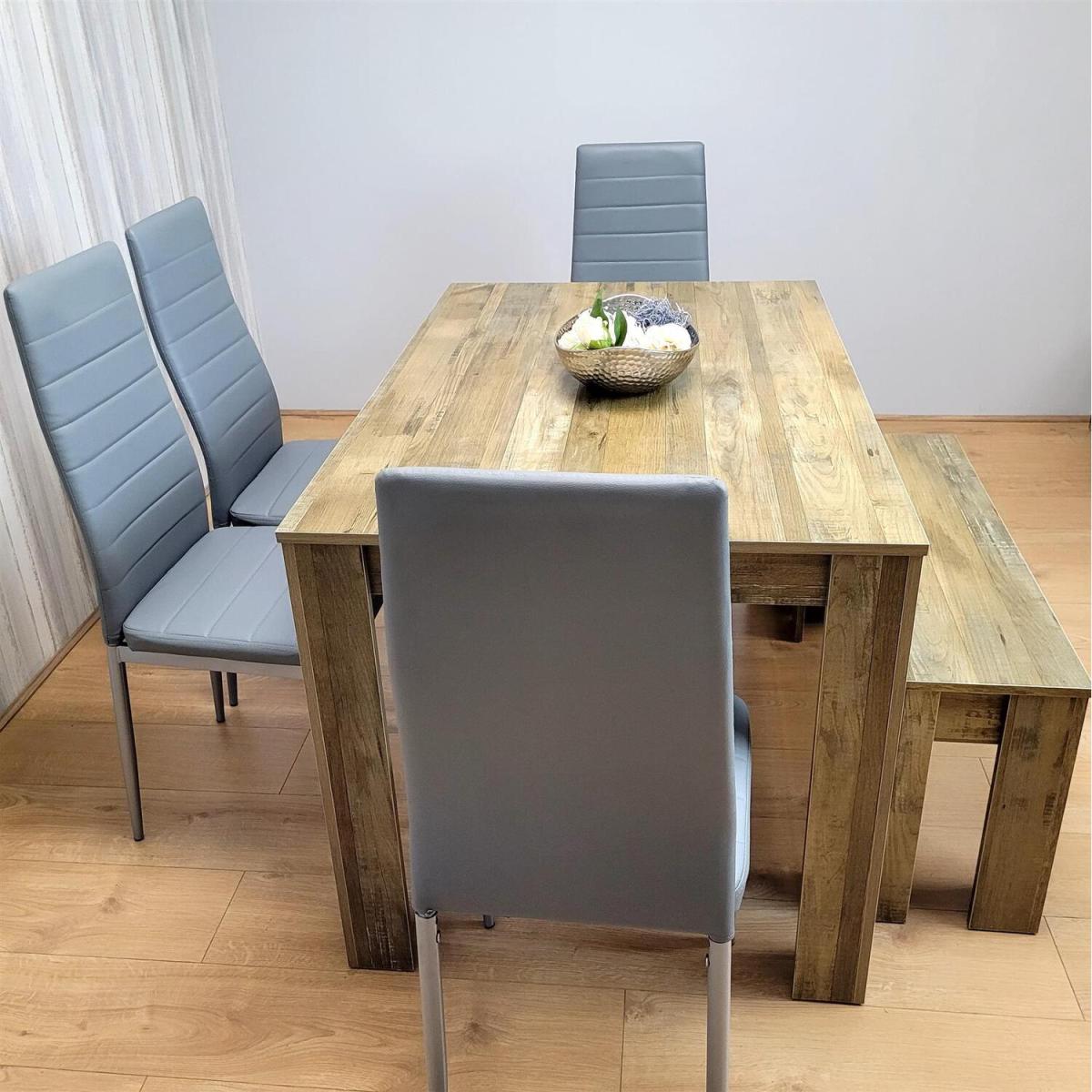 A Stunning wooden brown rustic effect Dining Table set included set of 4 faux leather padded black metal chairs with slightly curved back design, and 1 bench. The dining table colour is brown with rustic effect. The dining chairs colour available in black or grey with a slightly curved back design for fitting with body shape. The dinner table is crafted with high-quality MDF, and a melamine laminated finish to ensure a durable, long-lasting tabletop. The dining chairs are made of premium faux leather with metal chair legs. The seat height of the chair is 44 cm. The bench is made of high-quality MDF and has a matching rustic effect with a size of L90 x W30 x H45 cm. Clear instructions for our dining table set support straightforward assembly.