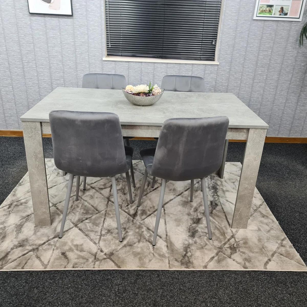 Stone grey Table with 4 grey velvet chairs. Transform & brighten your dining area with this stunning, contemporary dining table with 4 grey velvet chairs. The chairs are of a modern design. The table is made from wood and has a melamine laminated light stone grey effect, transforming your dining room and looks so spectacular and unique. The item comes flat packed and requires some home assembly. Table size : (W)117cm X (D)77cm X (H)75cm, Chair Dimension: 44(W) x 59(D) x 81(H)cm