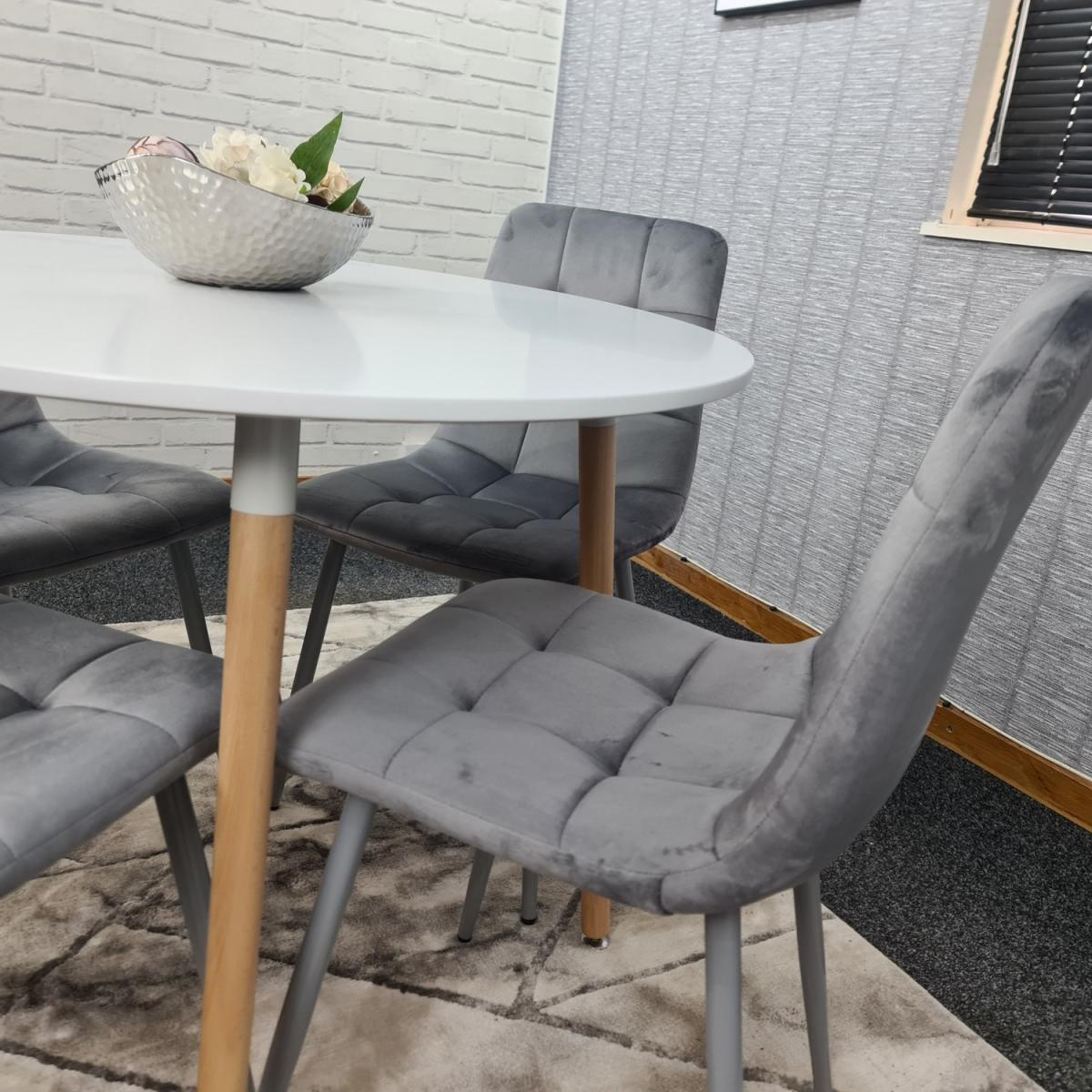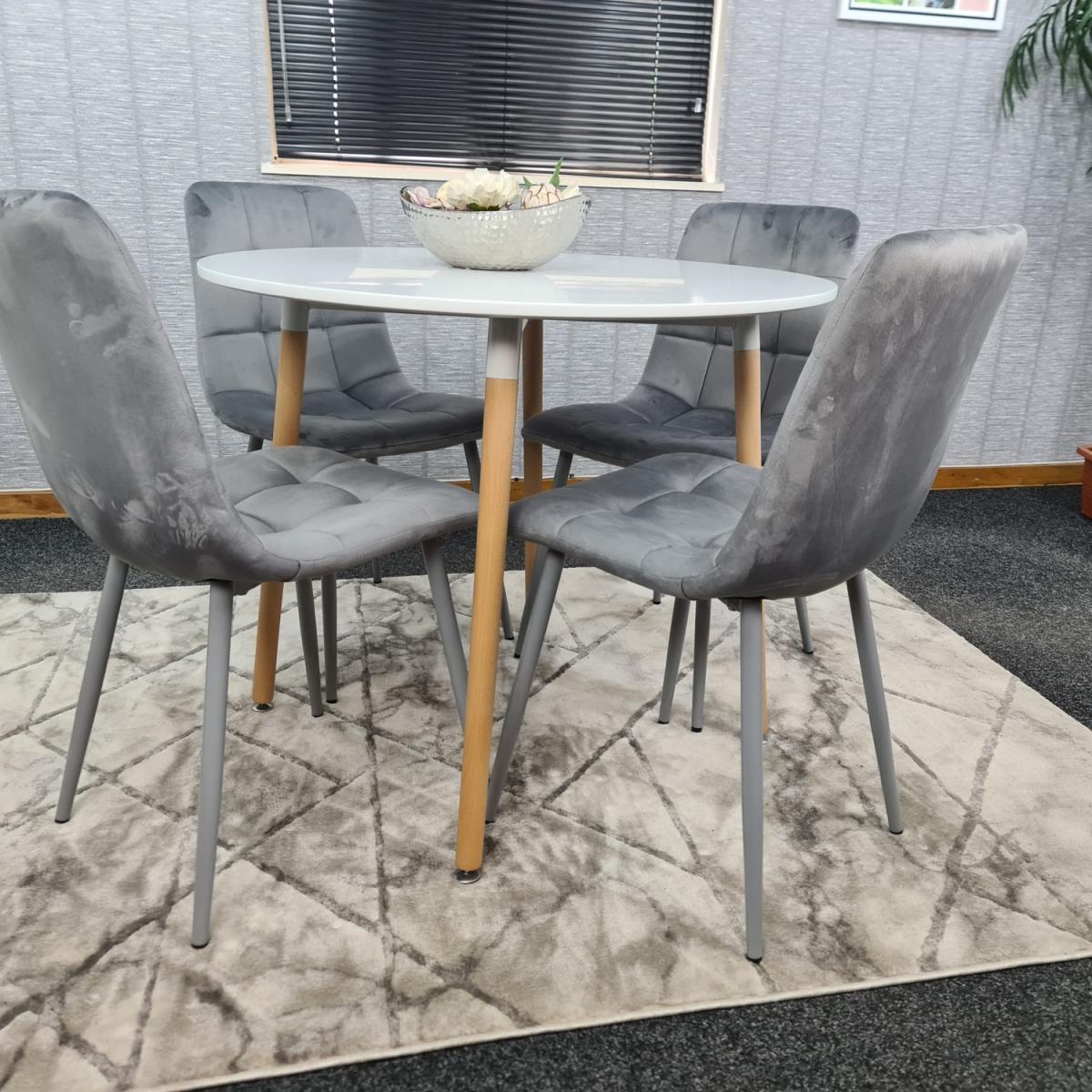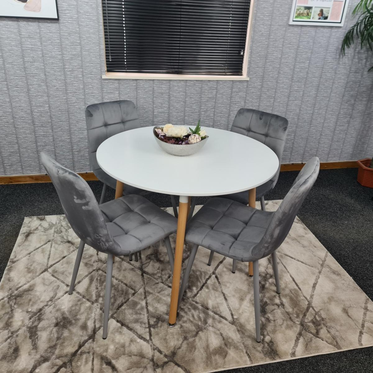 Stylish and modern white round table and 4 grey velvet chairs set, Transform & brighten your dining area with this stunning, contemporary white dining table with 4 grey velvet chairs. The chairs are of a modern design. The table is made from wood, transforming your dining room and looks so spectacular and unique. The item comes flat packed and requires some home assembly.