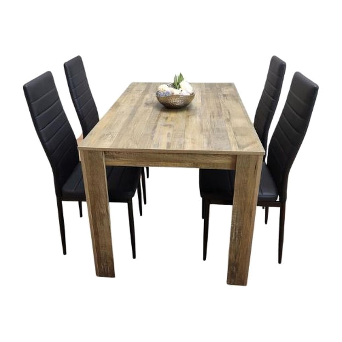 A stunning rustic style dining set featuring a wooden brown effect table crafted from high-quality MDF with a durable melamine finish. Includes four sleek faux leather padded chairs with a curved back design for comfort, available in black or grey. Sturdy metal legs and a 44cm seat height ensure style and support. Easy assembly with clear instructions.