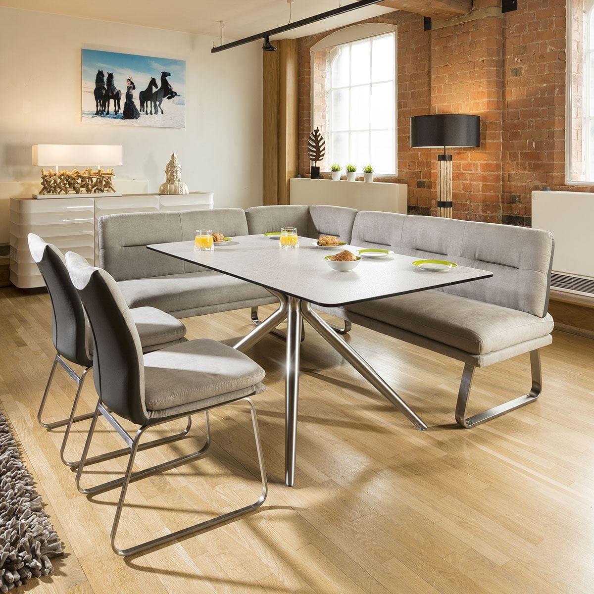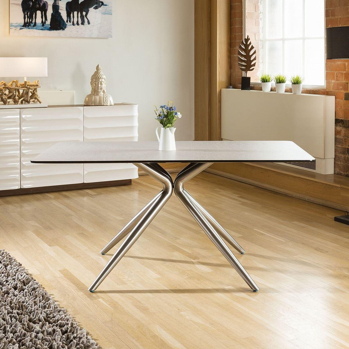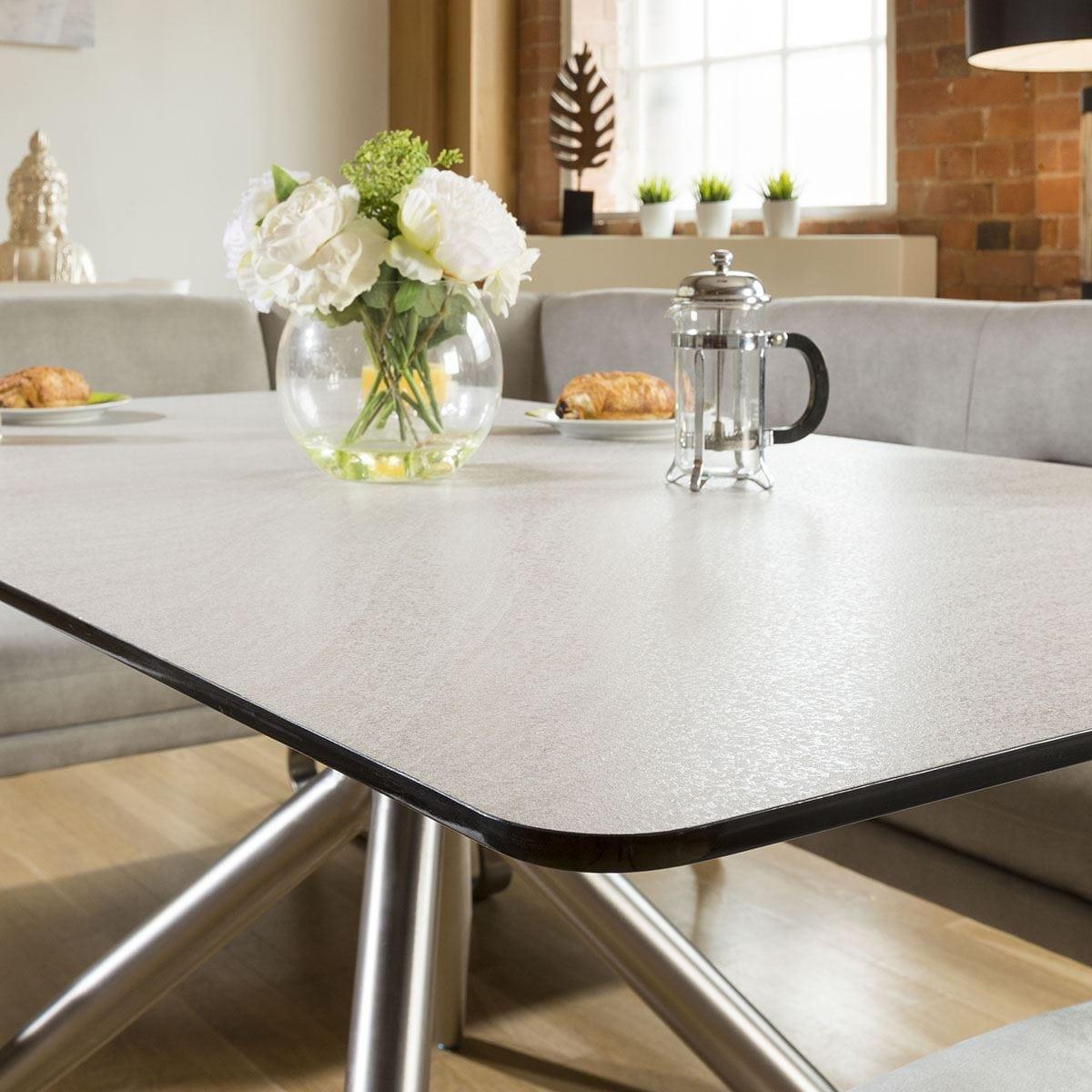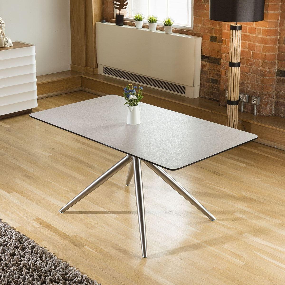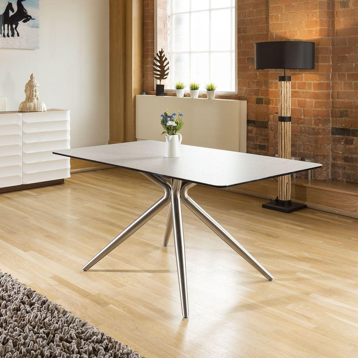 High Quality Durable Rectangular Dining Table With Stone Grey/ White Melamine Bevel Edge Black Top With Brushed Stainless Steel Legs. A lovely rectangular dining table for seating upto 8 people comfortably. Features include mixed stone grey and white table top, black bevel edge and brushed stainless steel legs. Very strong and sturdy. W160cm D90cm H75cm Modern Design Premium Quality Furniture
