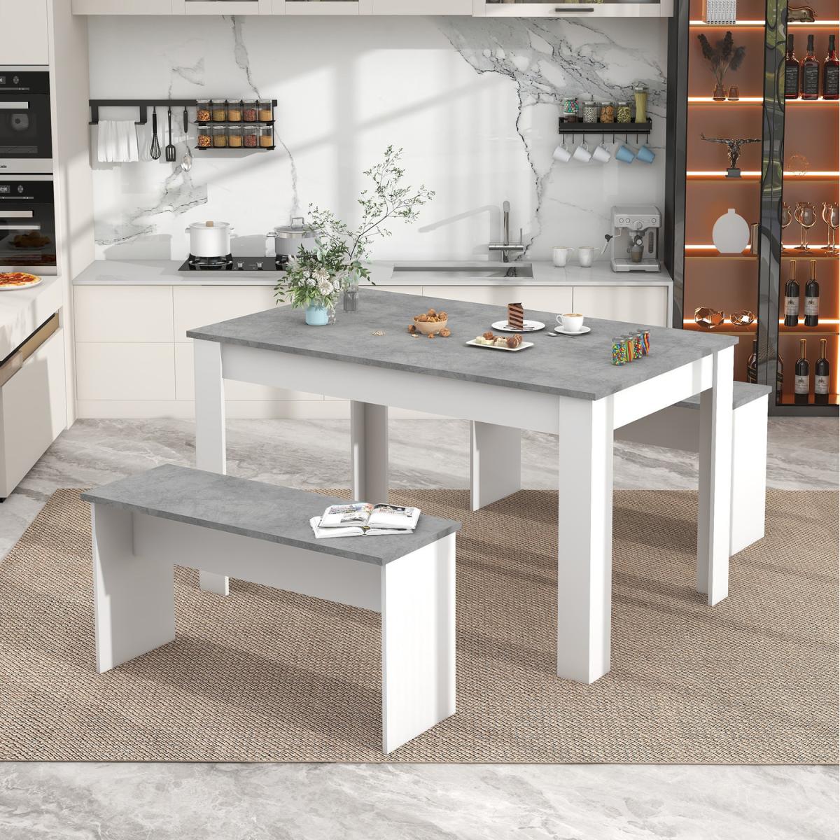 Unique Marble Look Finished with a white artificial marble top and elegant white frame, adding a stylish, upscale feel to any space that will complement most modern decor. Nice Firmness You Can Rely on Expertly crafted from premium 1.5cm-thick E1 MDF with PVC covered for superior stability to effortlessly withstand daily use in the home. The dining set will become a staple of your home and provide worry-free seating for years to come. Compact Design This product fits well in small and tight spaces due to its functional yet compact design. Easy to Maintain The E1-level board is non-toxic and environment-friendly. Table and benches with smooth and good waterproof top surfaces are easy to maintain and clean. Simply wipe with a damp cloth and dry. Assembly Dimensions Easy set up with clear instructions included.