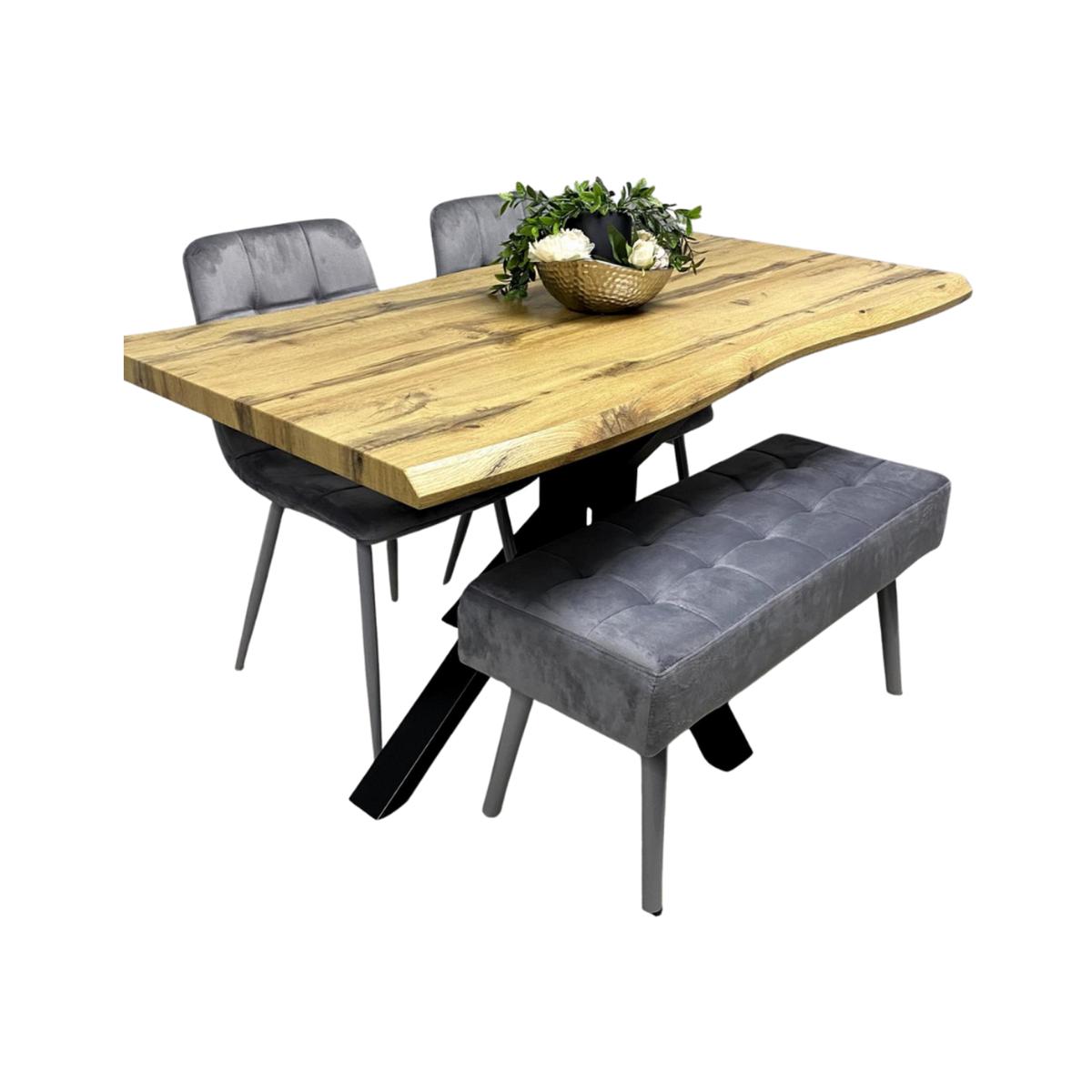 This stunning wooden rectangular brown dining table set includes two grey velvet chairs and a velvet padded grey bench, offering a practical and stylish solution for everyday dining. The table features a sturdy 40mm veneer top with curved edges and strong X-shaped powder coated iron legs that provide excellent stability. The grey velvet chairs offer soft, comfortable seating and are supported by durable metal legs with rubber capped feet for floor protection. The bench is built to match, with the same curved edge veneer and reinforced iron base for a cohesive and reliable design. The set is easy to assemble with clear instructions included. Features Durable table construction with 40mm veneer top, curved edges and reinforced X-shaped iron legs for strength and stability Comfortable grey velvet chairs with powder coated metal legs Matching velvet padded grey bench with curved edge veneer and strong X-shaped iron legs Modern minimal design with powder coated iron legs for a clean look Rubber capped chair legs for floor protection Easy assembly with clear instructions