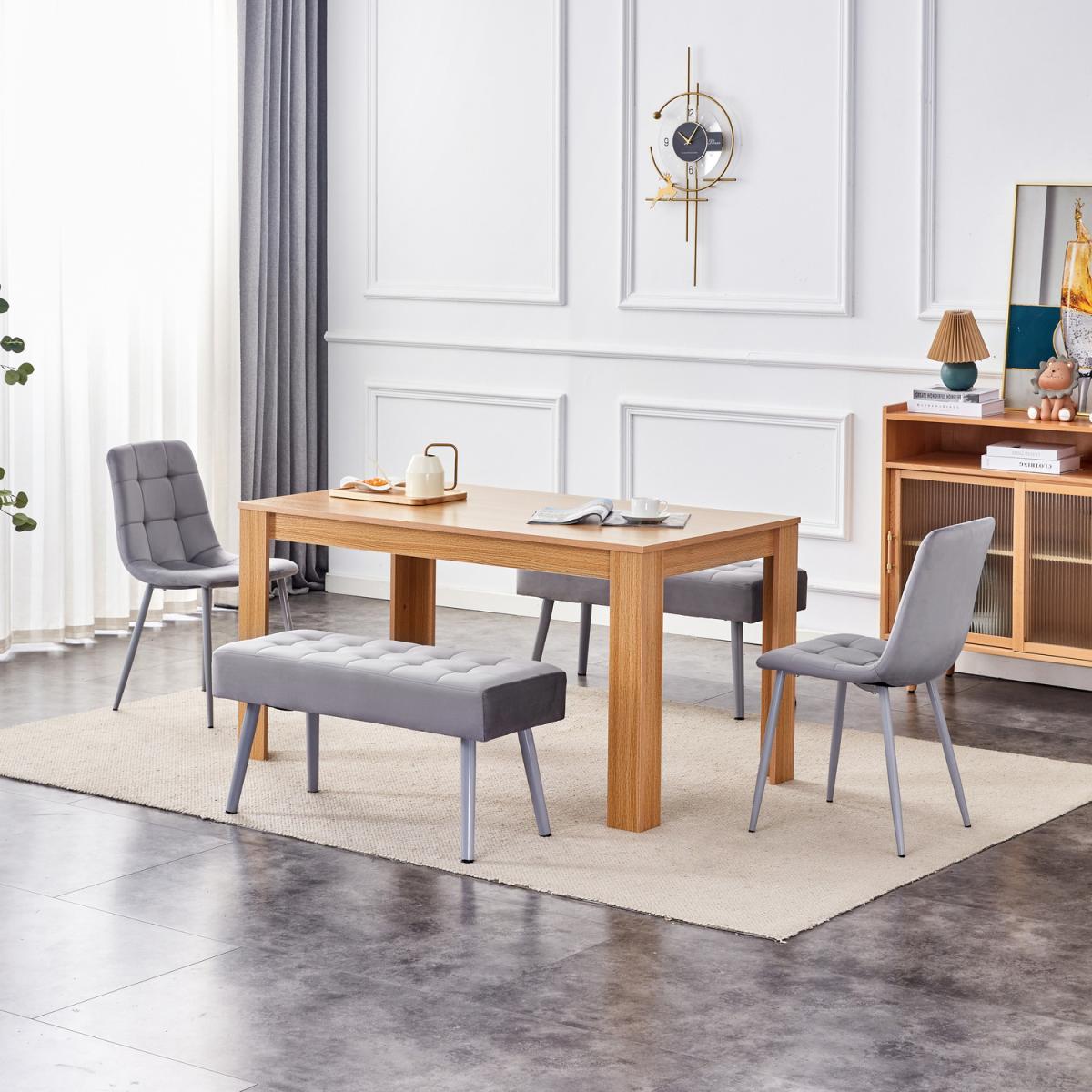 The Kosy Koala Dining Table set comes with 2 chairs and 2 benches. The dinner table is crafted with premium MDF, a beige colour with a melamine laminated Light Oak natural wood grain finish. The grey dining chairs are made from high-quality velvet with metal legs. Clear instructions are included for easy assembly. Grey Velvet dining bench with a soft grey velvet padded seat with stylish stitching and tufting. The chair's material is velvet with metal legs. Legs prevent damage with the adjustable foot protection provided. Table available in different sizes. The seat height of these chairs is 45 cm.