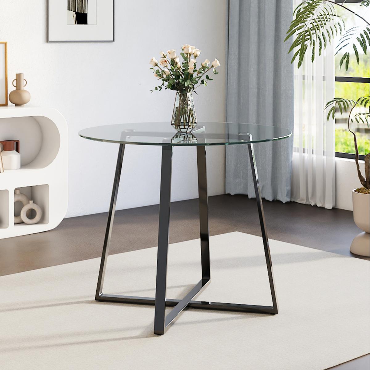 This round dining table features a solid tempered glass tabletop, supported by two metal trapezoidal frames that divide the base into four sections, providing just the right amount of space for four people. Its smooth surface makes it easy to clean, and the metal frame at the bottom is equipped with non-slip pads to protect the floor and enhance the table's stability. With a geometric design, this table combines simplicity with durability, thanks to the high-quality tempered glass and sturdy metal base. It's ideal as a dining table for small gatherings or as a stylish decorative piece for a lounge.