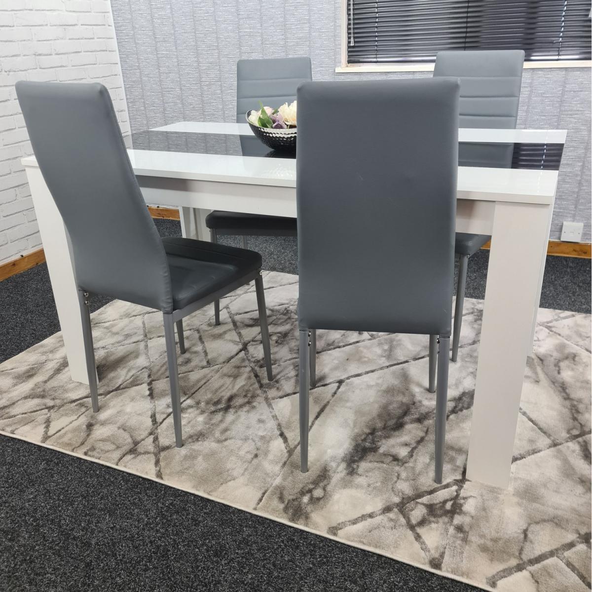 The dinner table set comes with set of 4 faux leather padded metal chairs with slightly curved back design for fitting with body shape. The black and white dinner table is crafted with premium MDF. The table features a stunning white wooden surface with a striking black stripe painted in high UV painting. The dining table colour is white with a striking black stripe. The dining chairs are available in Grey, Black/White mix (2 black+2 white), and White Colours are made from high-quality faux leather with metal chair legs. Chair Size: H96 x L41 x W52 cm. Clear instructions are included for easy assembly.