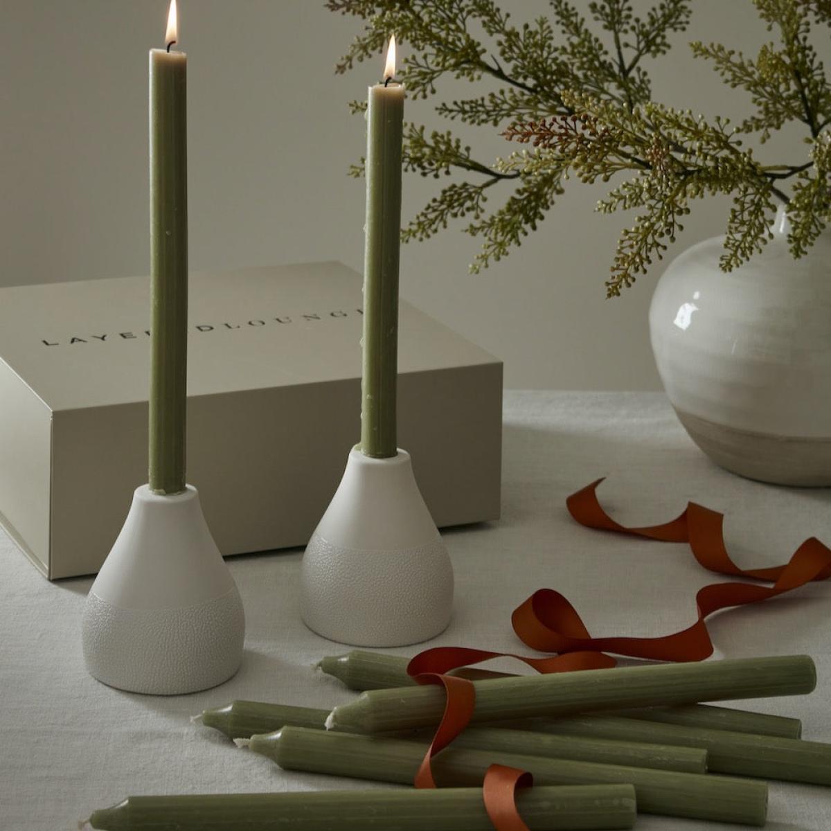 The prefect gift set to present to your host. The dinner candles gift set contains a set of 2 short textured ceramic candle holders plus a set of 8 green dinner candles all presented in a Layered Lounge gift box.