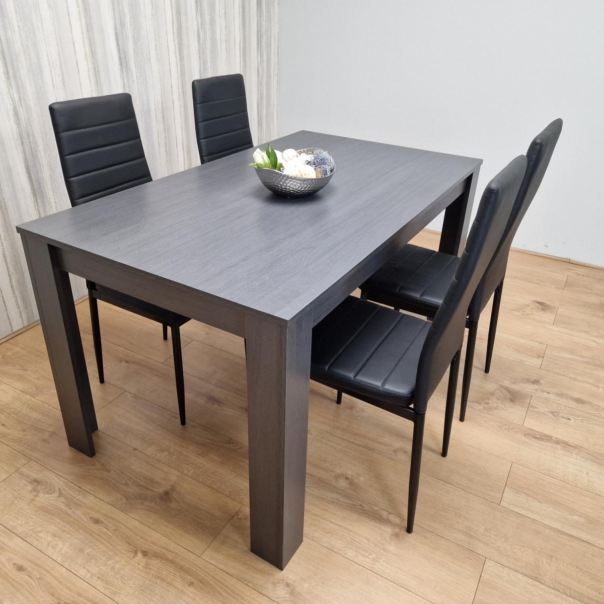 Enhance your dining area with our stylish Dining Set. Crafted from high-quality MDF in grey, this set effortlessly combines aesthetics and practicality. The dining table features a sleek grey tabletop with Arrow effect, making it a versatile addition to your dining space. Whether it's a family meal or a casual get-together, this table provides a solid foundation for your dining needs. Included in the set are four matching Black Chairs upholstered in faux leather for a touch of sophistication and easy cleaning. The chairs rest on sturdy metal legs with great strength and durability with adjustable foot protection, ensuring stability on various floor surfaces. This practical feature ensures that your dining experience is comfortable and wobble-free, the chairs seats and back rest are extra padded cushioned for extra comfort when you sit on. This dining set is conveniently shipped in a flat-pack format, allowing for straightforward assembly upon arrival. Easy-to-follow instructions ensure a hassle-free setup, so you can start enjoying your new dining set in no time. Our service offers fast and free delivery, along with a one-year warranty that covers the replacement of any faulty or broken parts during your use of the table.