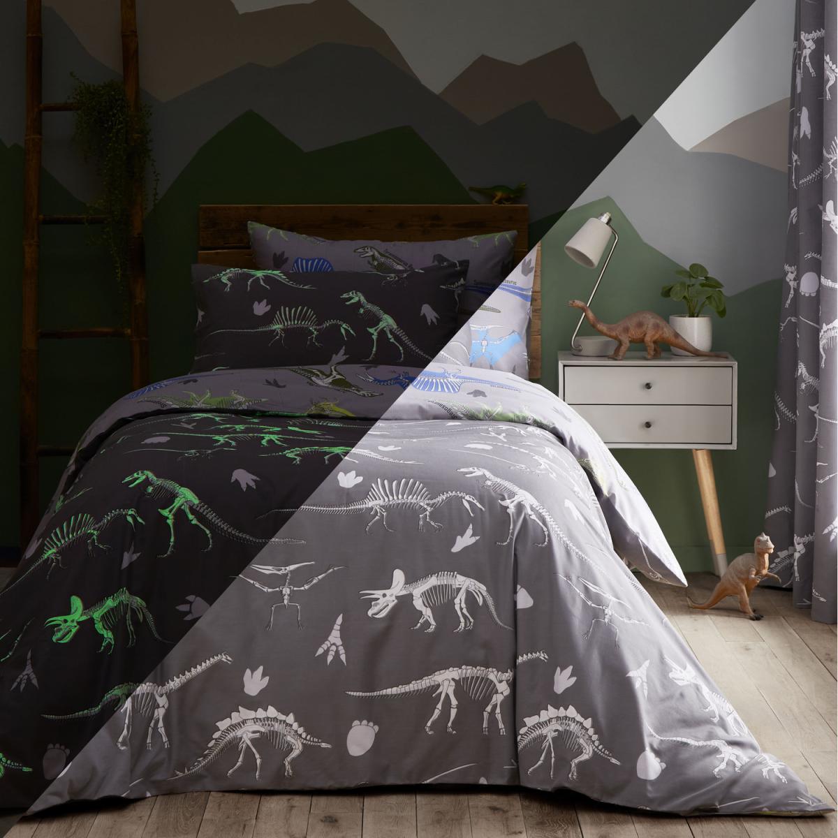 A Dino glow in the dark polycotton duvet cover set is a bedding set that features a design with dinosaur illustrations, which are designed to glow in the dark. These duvet cover sets are made from a blend of polyester and cotton, commonly known as polycotton, which combines the durability of polyester with the comfort and breathability of cotton. The glow-in-the-dark feature usually requires exposure to light before it can emit a glowing effect in the dark. When the lights are turned off, the dinosaur designs or specific areas of the duvet cover set will emit a faint or glowing light due to the stored energy from exposure to light. These types of bedding sets are popular, especially among children or dinosaur enthusiasts, as they can create a fun and visually appealing night time atmosphere in bedrooms. When purchasing such a duvet cover set, ensure to follow the care instructions provided by the manufacturer to maintain the glow-in-the-dark effect and the quality of the bedding.