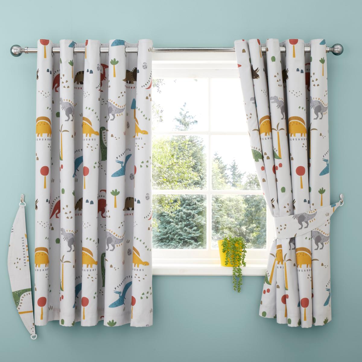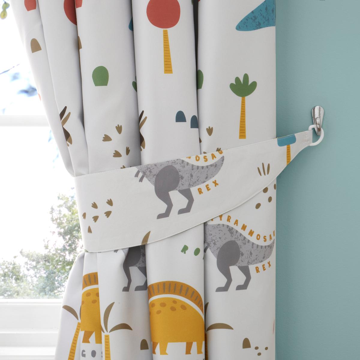 * Eyelet header* Pair of Blackout curtains* Dinosaur design* Coordinating Tiebacks available Add some colour to your little dino's bedroom with this pair of eyelet curtains. A fun and colourful way to finish off your little one's bedroom printed with different types of dinosaurs all over. These curtains feature a blackout lining, reducing unwanted light giving your little one an uninterrupted and dreamy night sleep. Crafted from soft polyester material which can be dry cleaned. This collection is verified by OEKO-TEX and independently tested for harmful substances as well as manufactured using sustainable processes under socially responsible working conditions.