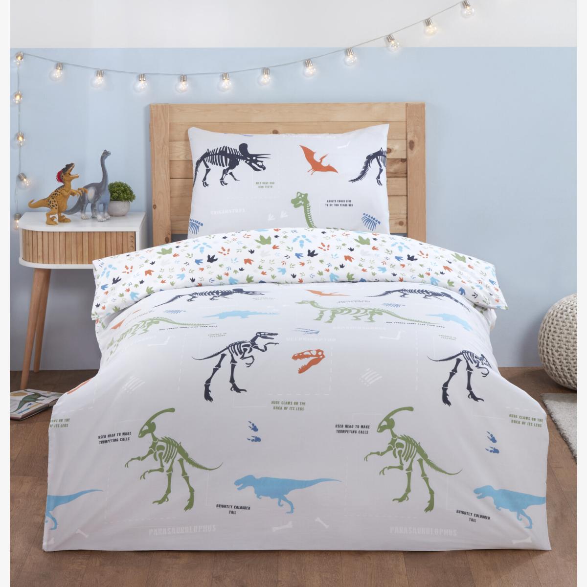 This Dinosaur Duvet Cover and Pillowcase Set is great for any dino lover. Made from polycotton, this soft and comfortable bedding is a roarsome addition to any bedroom and is sure to help your child snuggle down in style. With a reversible design, it features dino skeletons on one side and a pattern of footprints on the other.