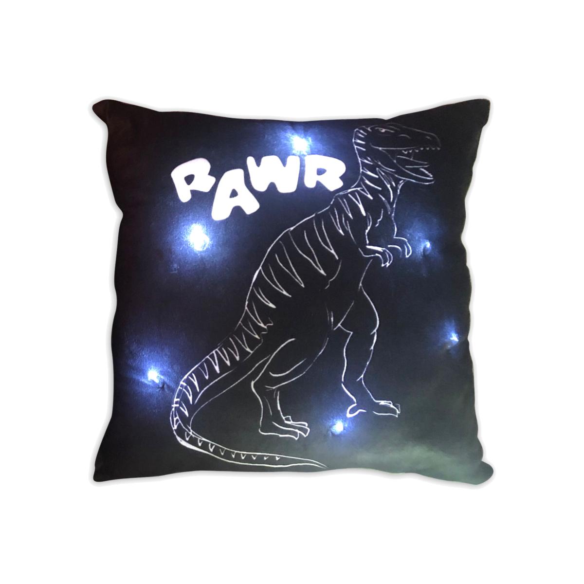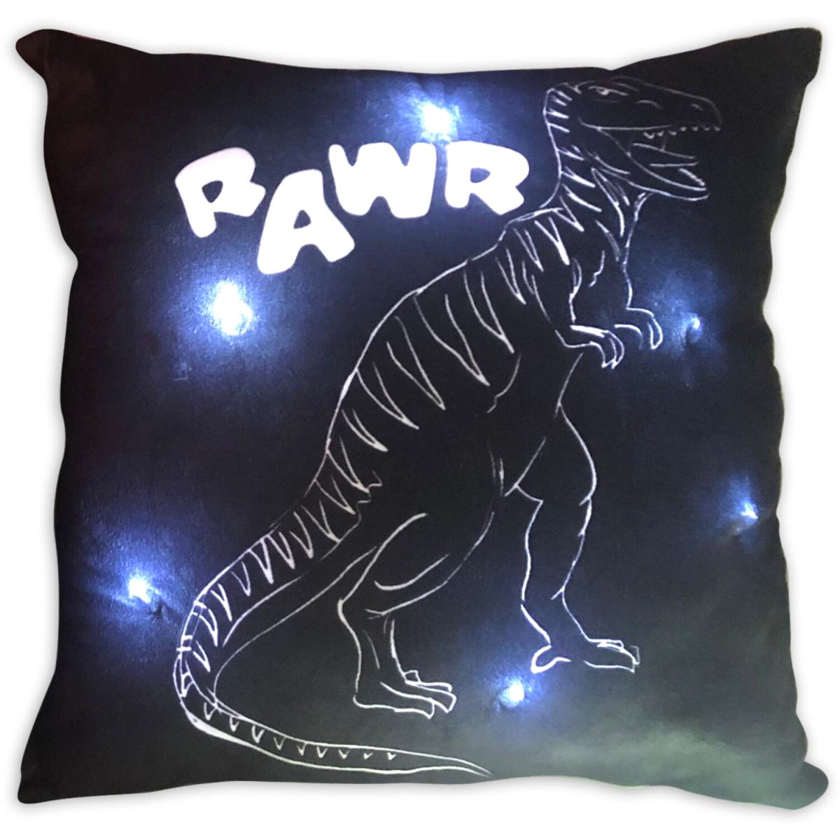 A great novelty cushion to have in your bedroom, den, or even your living space, the Dinosaur Light Up Cushion features a t-rex illustration and glows with multiple white LEDs. Ideal for dino-lovers, this black cushion reads 'rawr' and will look awesome among themed décor or as a cool addition to a laid-back space.
