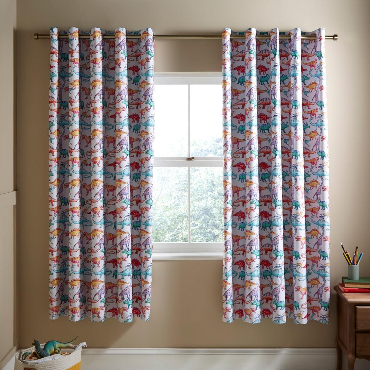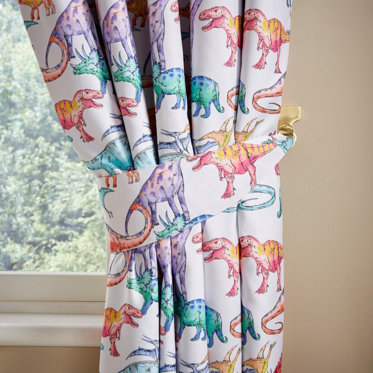 **In collaboration with the Natural History Museum*** Colourful Dinosaur Design* 100% Cotton* Blackout Lining* Eyelet Curtain* Matching items available Embark on a journey of discovery with The Dinosaurs Gallery Eyelet Curtains, where prehistoric wonders will excite any Dinosaur enthusiast. Finished in a colourful prehistoric print, these curtains usher in the serenity of sleep with their blackout lining. Effortlessly hung by an eyelet header, these blackout curtains will prevent any unwanted light sneaking in. Complete the set with matching items, creating a cohesive prehistoric vibe in the bedroom.**Natural History Museum x Dunelm**Since the name ‘Dinosauria’ was first coined back in 1842 by the founder of the Natural History Museum, Sir Richard Owen, there has been a public fascination with these awe-inspiring creatures. And where better to learn more about these prehistoric beasts than at the Museum’s Dinosaur Gallery that houses the world’s most diverse collection of dinosaur fossils including the most complete Stegosaurus in the world and the jawbone of the first T. rex ever found. This collection celebrates dinosaurs from the different time periods spanning the Mesozoic Era, celebrating their enduring appeal to kids and adults alike. © The Trustees of the Natural History Museum, London 2024. All Rights Reserved. This product is OEKO-TEX MADE IN GREEN certified, meaning it was produced in OEKO-TEX S Te P certified factories - verifying environmental, social, and chemical standards in the facility. It has also been certified to OEKO-TEX STANDARD 100, the original safety standard for everyday confidence. To offer full visibility, the production stages throughout the supply chain can be traced.