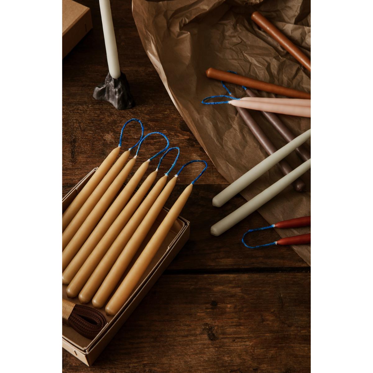 Dipped candles handmade candles 15 cm 8 pack from Ferm Living come in an elegant design with a tapered top and blue wick. The hand-cast candles sit two by two and are available in a wide range of beautiful colours. Choose your favourites from Ferm Living's Dipped candles range and use them in your finest candle holders.