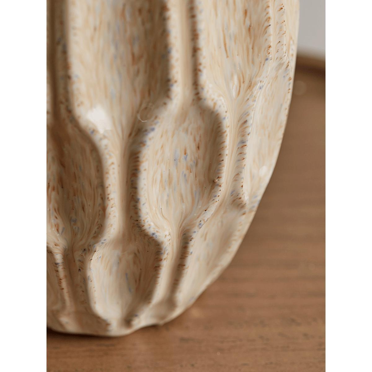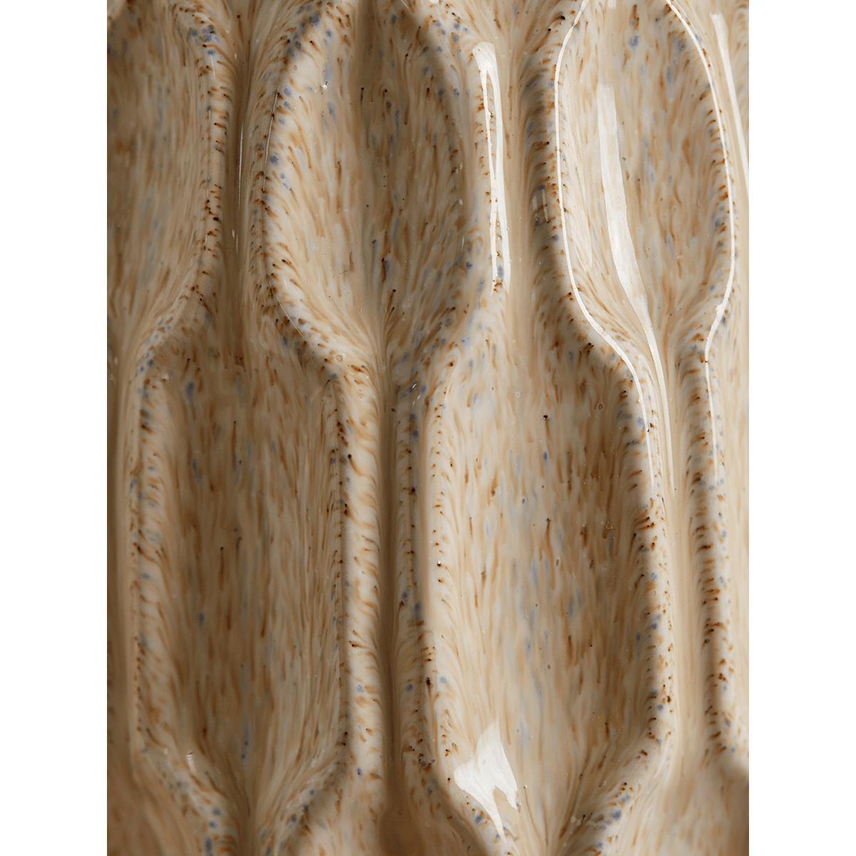 This vase is a fantastic piece for adding subtle texture and understated style to a variety of interiors. I love it because of its soft glaze finish and geometric pattern, which give it contemporary appeal while remaining versatile. It works particularly well in minimalist or Scandinavian-inspired spaces, but can also add warmth to more eclectic looks. For practical styling, I recommend pairing it with simple, loose arrangements like eucalyptus, as shown, to emphasise its natural aesthetic. Its elongated shape makes it ideal for placing on sideboards, shelves, or as a centrepiece on a dining table where it can stand out without overwhelming the space. Keep the colour palette neutral or soft for the best effect-you really don't need much to let it shine.