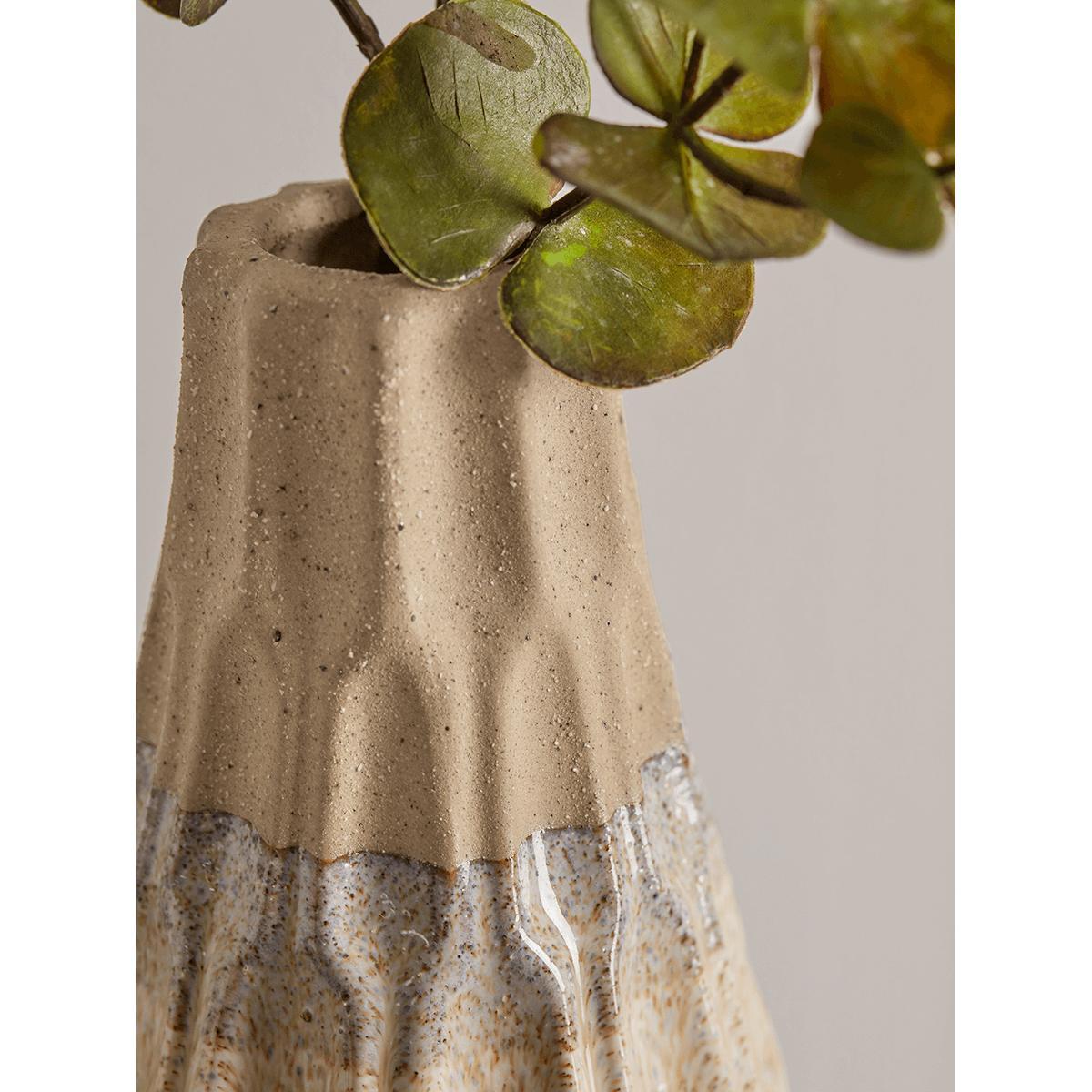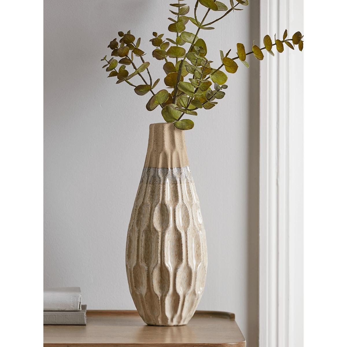 Perfect to display single stems, our characterful stoneware vase has a tall slender form and a geometric pattern to its surface. A decorative accessory to add texture and interest to any pared-back scheme by its raw stoneware top and characterful glazed body. We have styled ours with a single eucalyptus stem from our. Faux Plants and Flowers. Range.