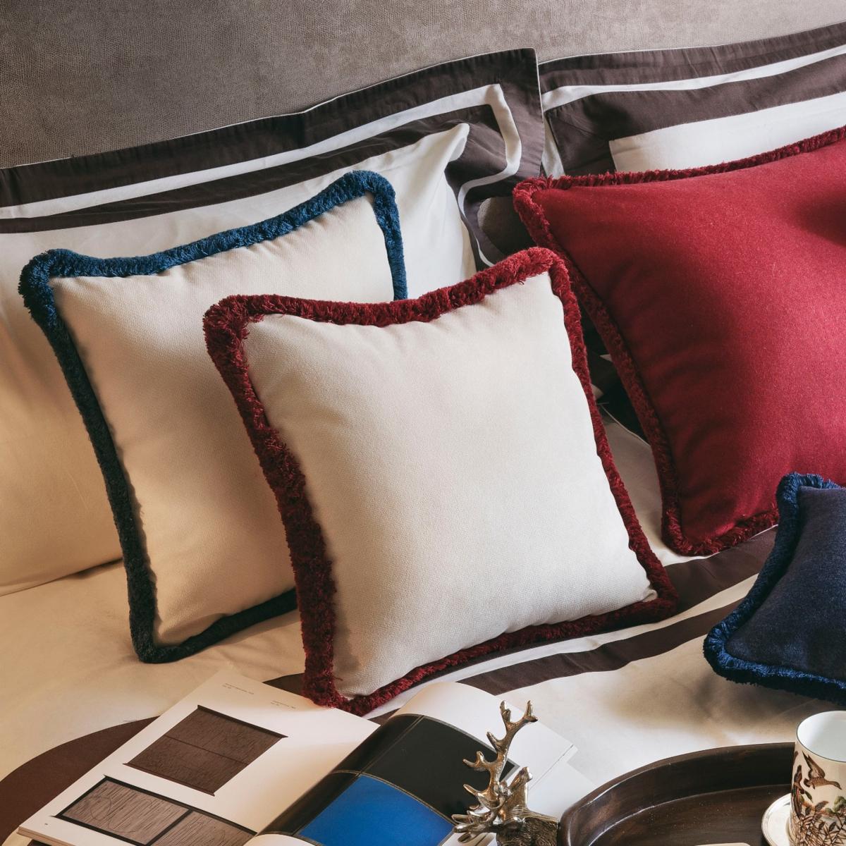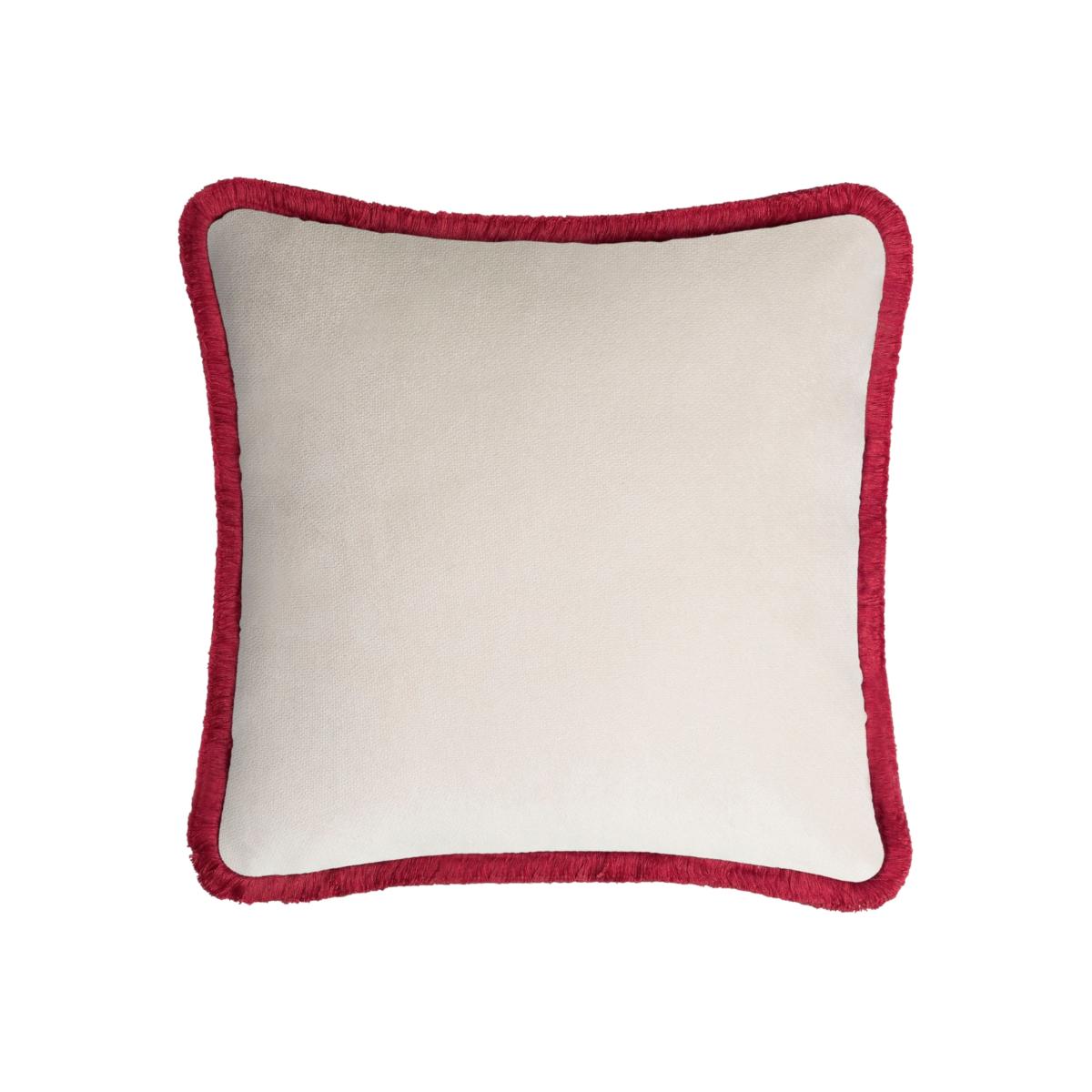 This elegant cushion from the Happy Pillow Collection is a romantic accent piece, that will make a glamorous statement in any interior decor. The dirty white hue of its removable velvet cover combines with the bold border of red cotton trimming outlining its square silhouette. Padded with soft polyester fiber, this cushion is a mesmerizing example of Lo Decor's excellent quality standards.