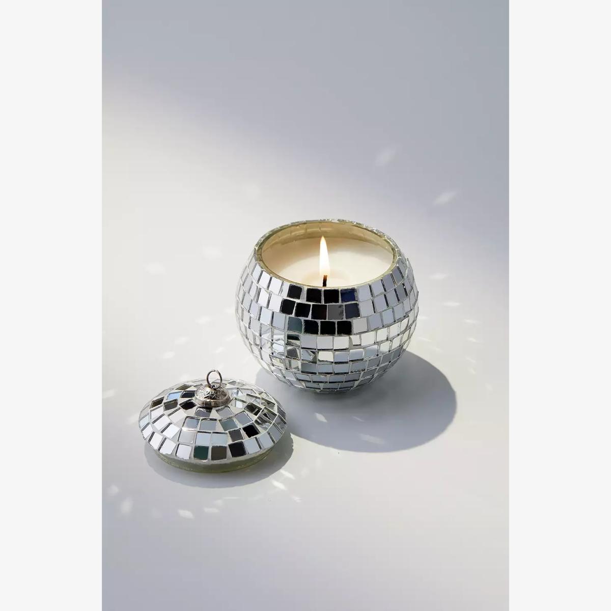 Bring the grooviest vibes to your space with this mirrored disco ball candle. Features small mirrored squares in a circular design with a top that comes off and a candle inside. **Content + Care** \- Glass, Wax \- Wipe clean