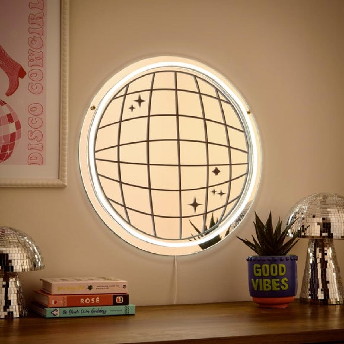 * Disco Ball Design * Mirrored Effect * Cool White LED Light * USB Connection Meet the Disco Ball Mirrored Neon Sign - a dazzling party piece. With a cool white LED neon light, and small holes to make sure it stays secure to your wall, this really adds a statement to your home.
