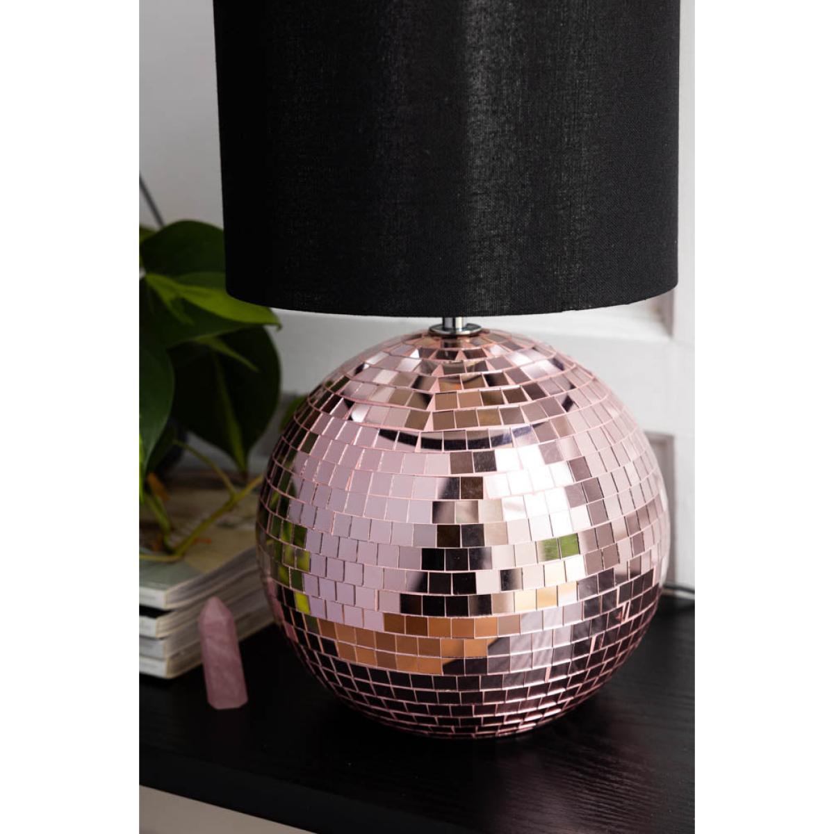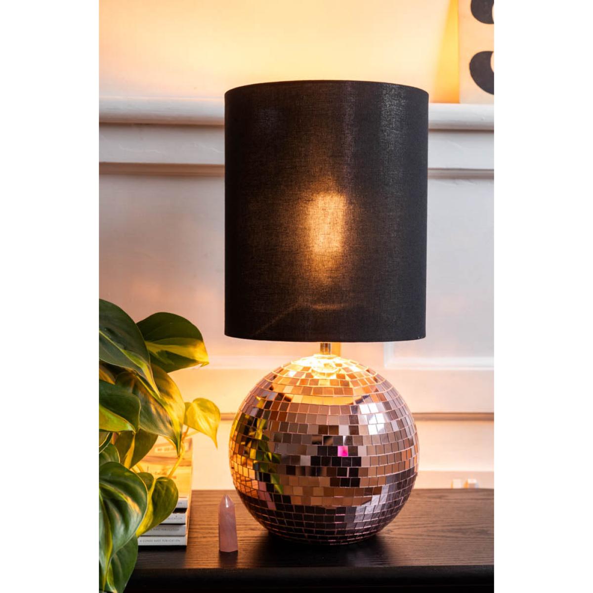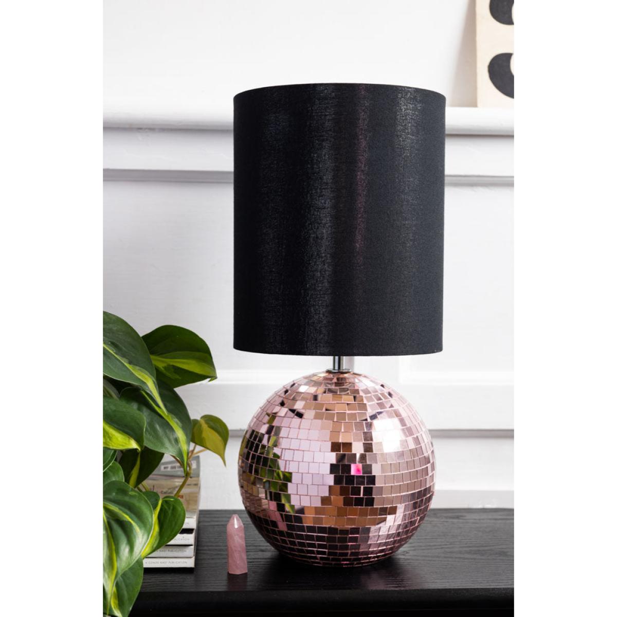 <!--td --> Brighten your space with our super fun and retro Disco Table Lamp In Pink. This sparkling lamp features a dazzling pink mirrored disco ball base, reflecting light in a beautiful way that brings a touch of nostalgia and excitement to any room. Topped with a smart black lampshade, this lamp balances vintage charm and modern style perfectly. Ideal for adding a pop of colour and personality to your living room, bedroom or office, the Disco Table Lamp In Pink is a statement piece that will light up your life in the most playful way possible. Embrace the retro vibes and let the party begin! - Disco Ball Table Lamp in Pink- Measures:H45cm x D20cm- Shade Measures: H25cm x D21cm- Base Measures: H20cm x D11cm - Material: Glass, Metal & Fabric Shade - Bulb Not Included - Bulb Required: E27 - Rating: IP20 - Flex Length: 180cm