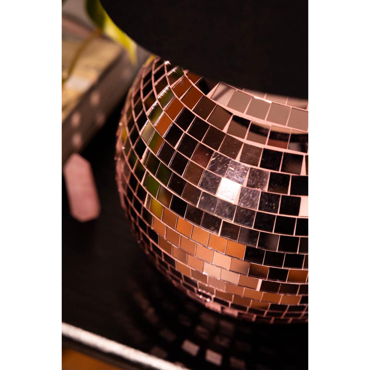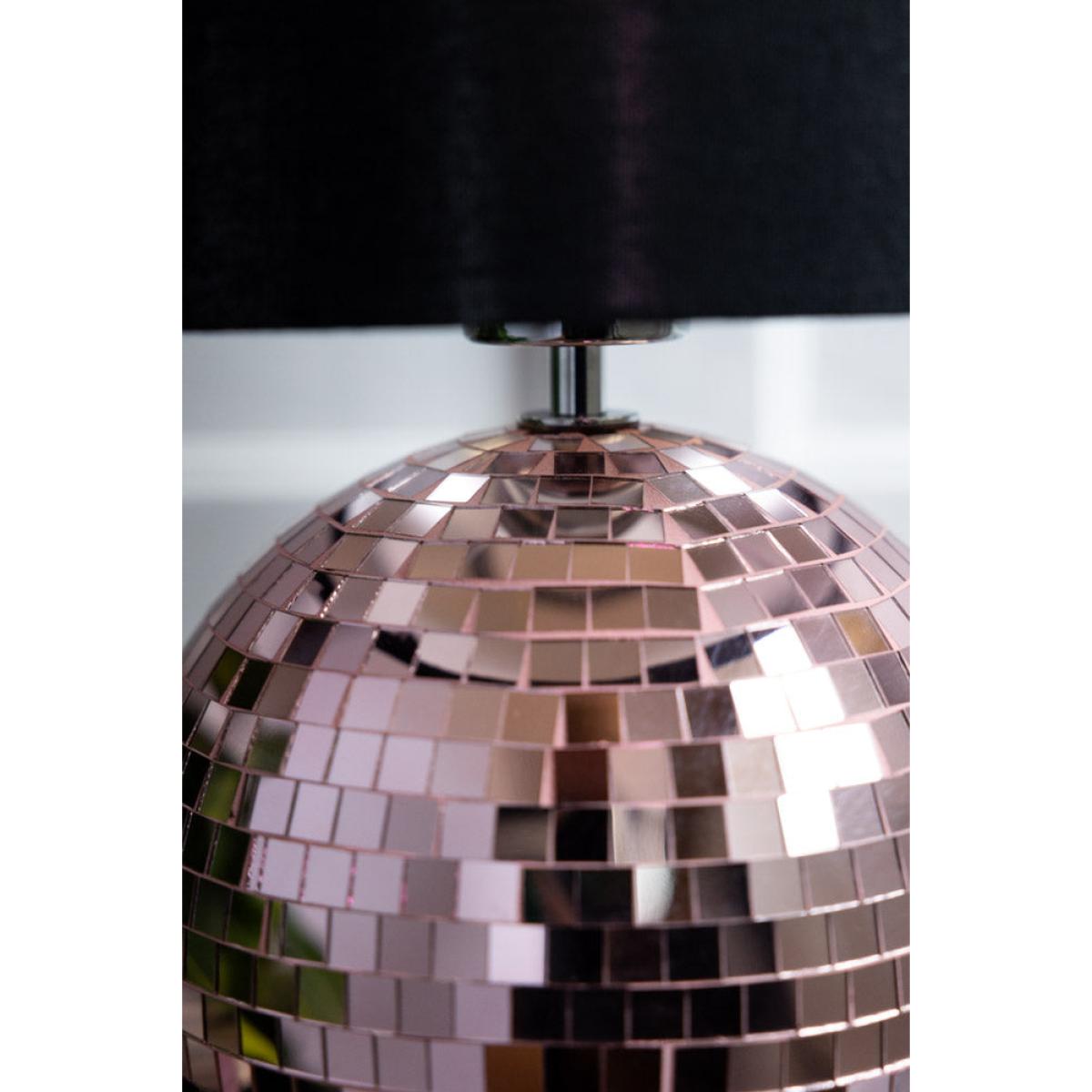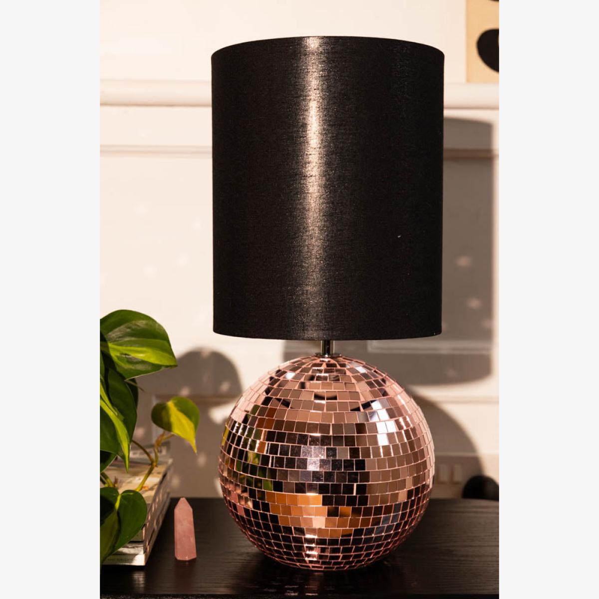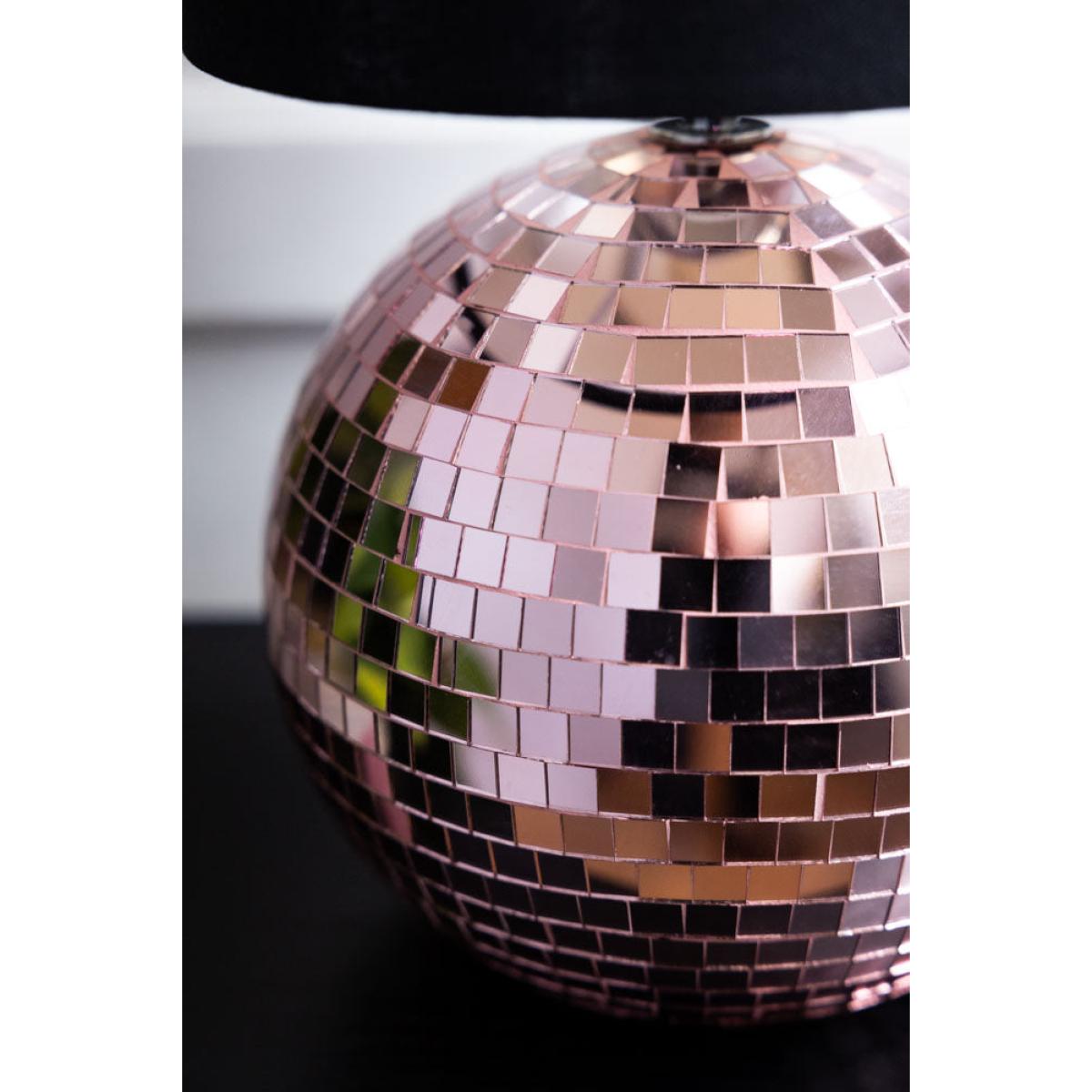 <!--td --> Brighten your space with our super fun and retro Disco Table Lamp In Pink. This sparkling lamp features a dazzling pink mirrored disco ball base, reflecting light in a beautiful way that brings a touch of nostalgia and excitement to any room. Topped with a smart black lampshade, this lamp balances vintage charm and modern style perfectly. Ideal for adding a pop of colour and personality to your living room, bedroom or office, the Disco Table Lamp In Pink is a statement piece that will light up your life in the most playful way possible. Embrace the retro vibes and let the party begin! - Disco Ball Table Lamp in Pink- Measures:H45cm x D20cm- Shade Measures: H25cm x D21cm- Base Measures: H20cm x D11cm - Material: Glass, Metal & Fabric Shade - Bulb Not Included - Bulb Required: E27 - Rating: IP20 - Flex Length: 180cm