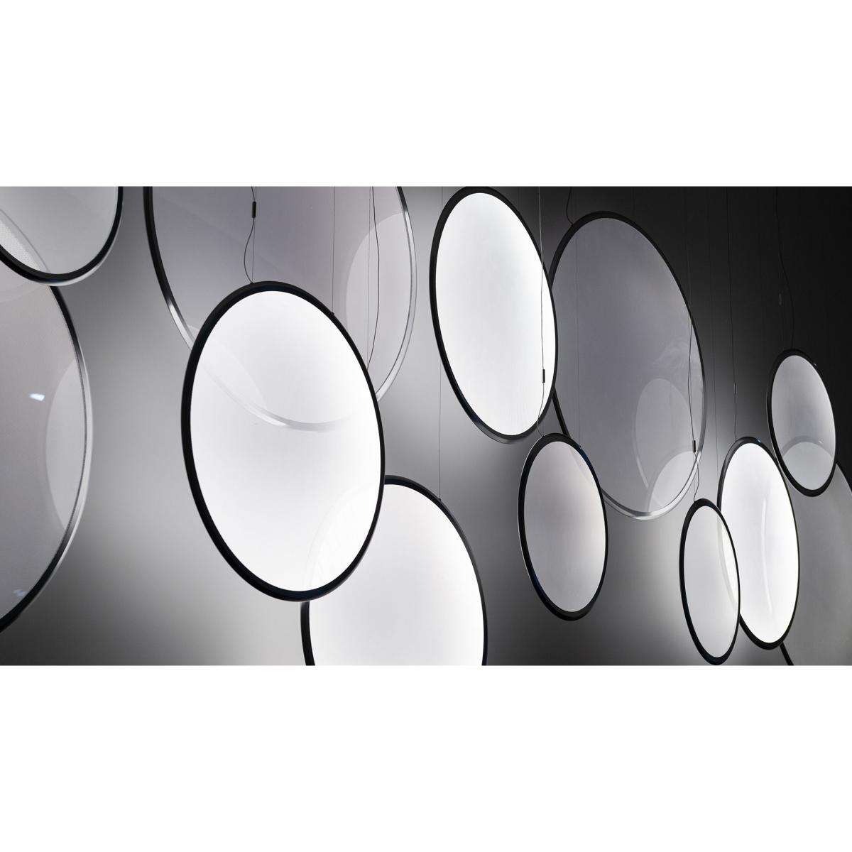 The lighting can be controlled by bluetooth using a smartphone app (free to download on Apple Store & Google play). Using the Artemide app, you can turn the light on and off, dim the lamp, create endless lighting scenarios for your home. Discovery is an almost invisible, intangible pendant that transforms and reveals itself once the light is on! It is made up of a large flat transparent PMMA disk (Ø 70 cm) placed vertically and framed with an extremely fine and light profiled aluminium ring. LED strips inside the aluminium ring project their light into the transparent central disk, and its surface lights up evenly. Once lit, the light takes up the middle section that was previously transparent. The inside of the pendant appears as if by magic, and metamorphoses from non-existent to this full and regular surface of light. This extraordinary result is obtained thanks to micro-incisions on the transparent disk that are almost invisible to the naked eye when the lamp is switched off. Their geometry and placement have been carefully calculated to obtain a constant emission, as well as a precise and timely light aura, according to a flow balance in relation to the emitting surface, guaranteeing perfect visual comfort. The Discovery pendant is an original development based on an optical principle made possible thanks to the technological expertise of Artemide and its in-depth understanding of light which is shown in the way it controls its interaction with material as well as in the very specific attention to detail paid to the finish and the quality of its perception. The technical innovation resides in the quality of the light cast from the transparent surface.