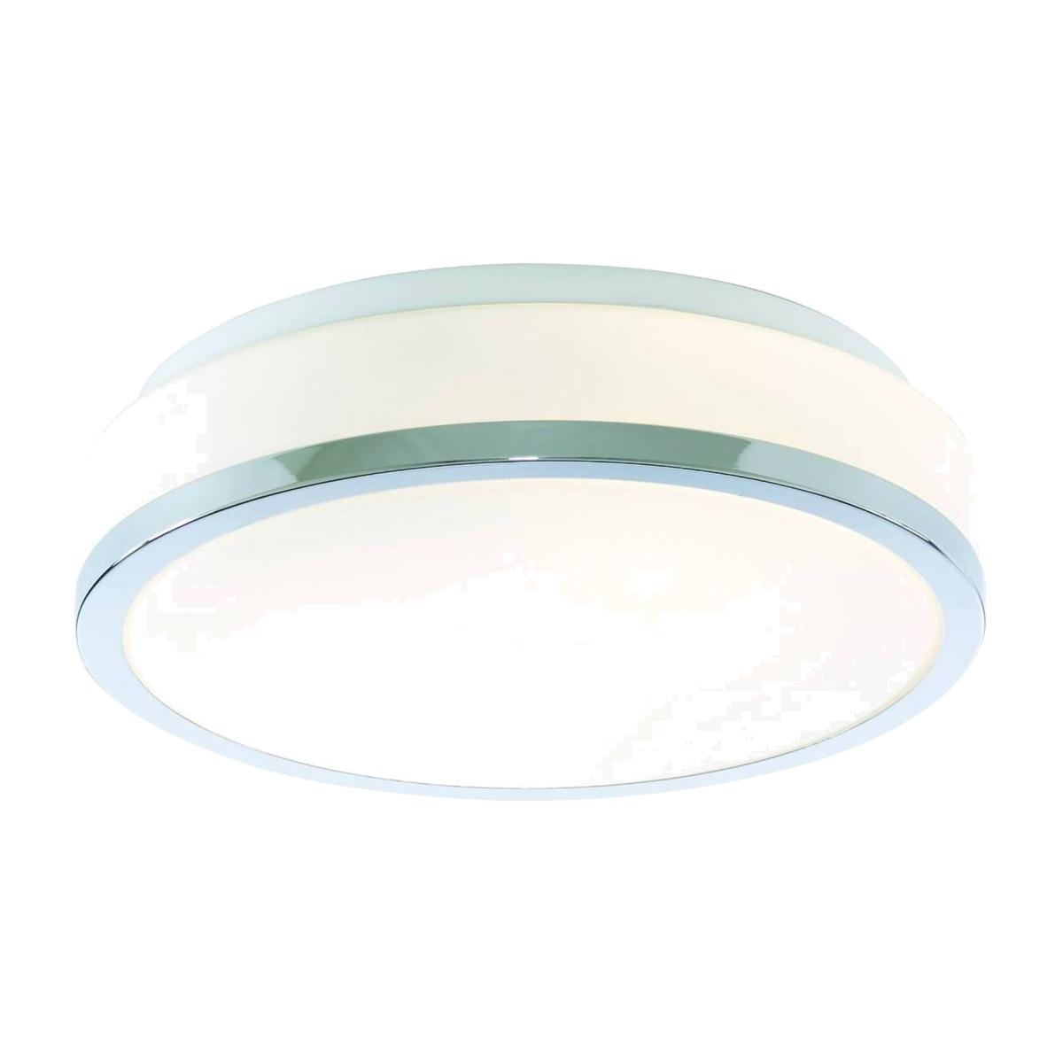 This 2 light flush ceiling light fixture with opal glass shade and chrome trim looks elegant on any bathroom or kitchen ceiling. The two lights are set behind a large 28cm diameter opal glass shade, which creates a beautiful lighting effect and brightens up the entire room. This simple white fitting has a stylish polished chrome finish trim to complete the look. This flush light is also IP44 rated and fully splash proof.