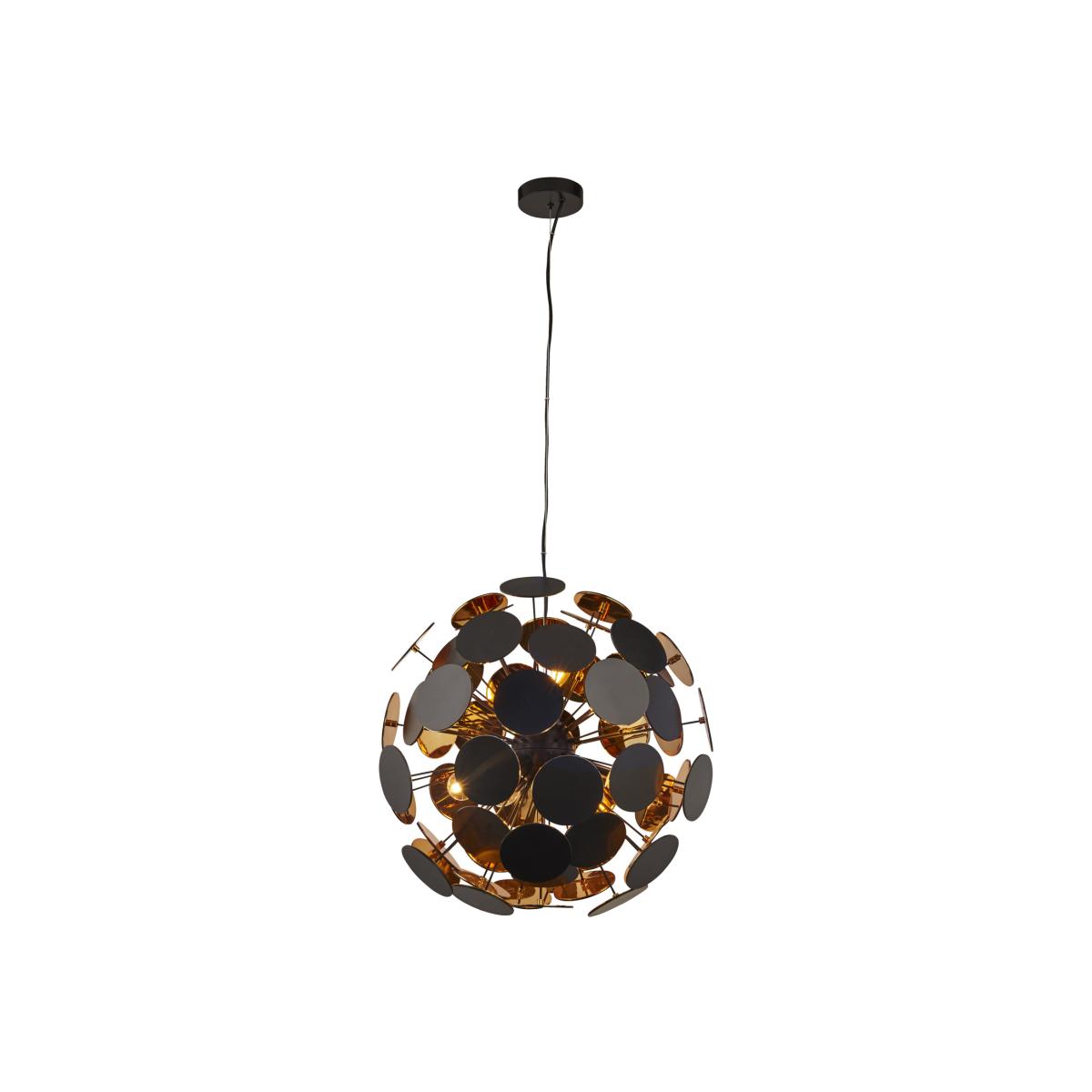The Discus 6 light pendant has a matt black finish and 4 light sources. The shade features metal spikes with rounded disc ends and a paint gold inner. The incandescent pendant can be used in a lounge, bedroom or hallway and is dimmable to choose your ideal light setting