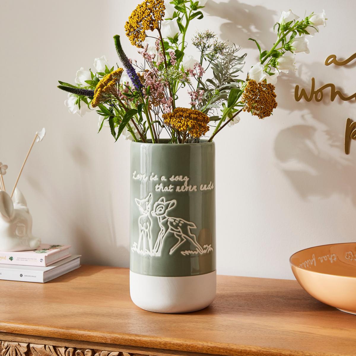 * Bambi Design* " Love Is a Song That Never Ends" Quote* Made from Ceramic* Reactive Glaze* Hand-Finished Detailing Display your favourite blooms in this beautiful Bambi-inspired vase, featuring Bambi and her mother with the loving quote “love is a song that never ends. ”Made from quality ceramic, it boasts a reactive glaze finish - making every vase uniquely different. Hand-finished detailing adds a special touch that brings this piece to life!
