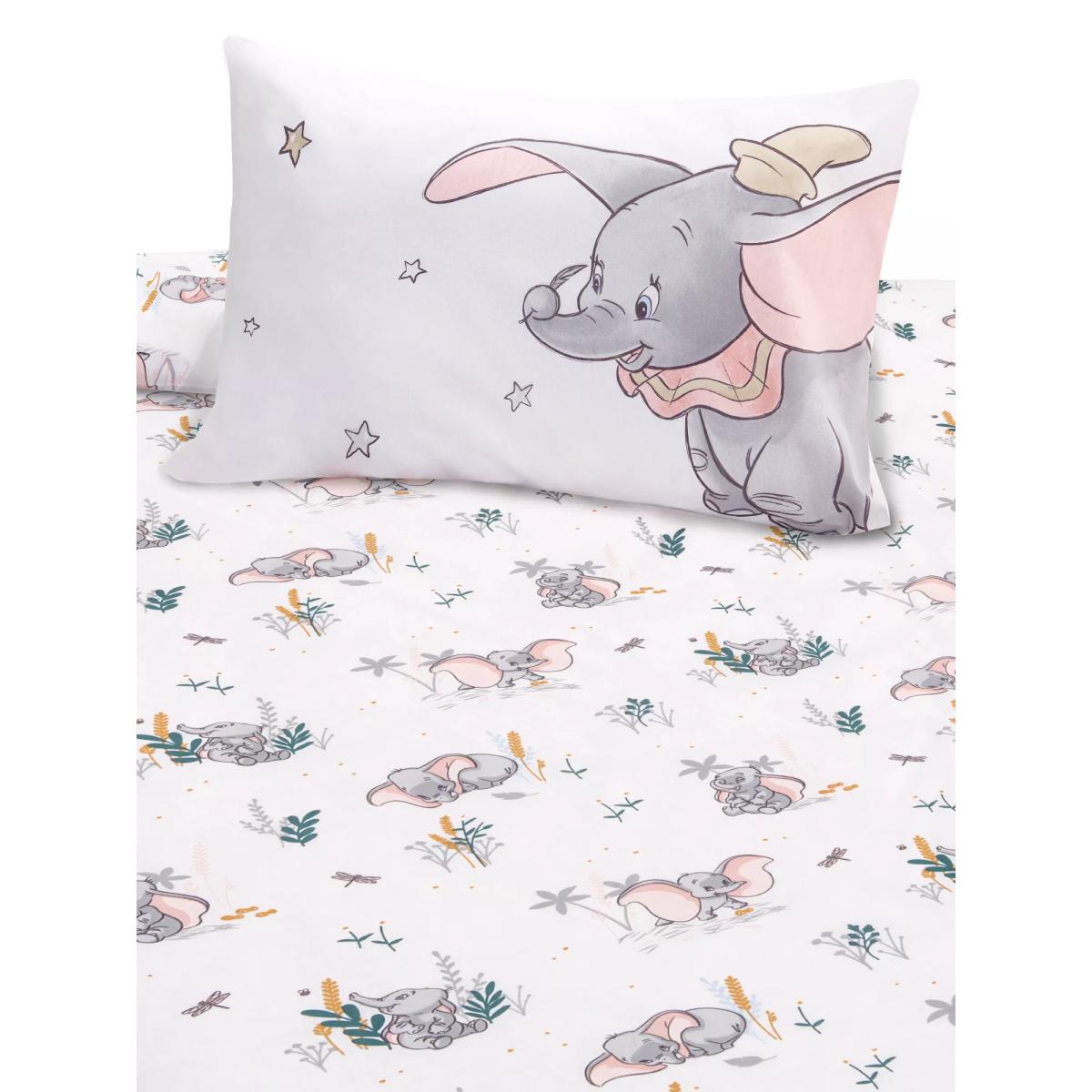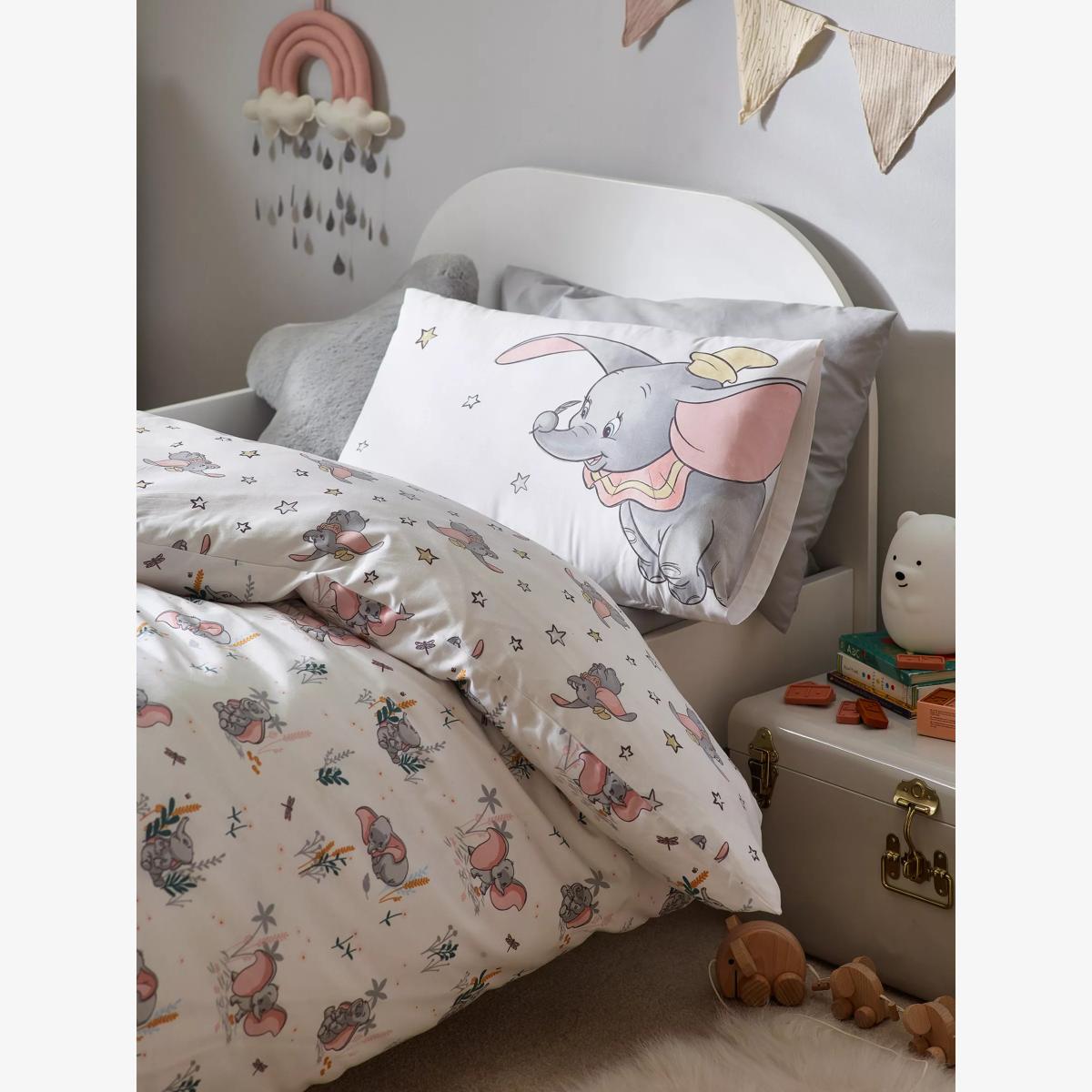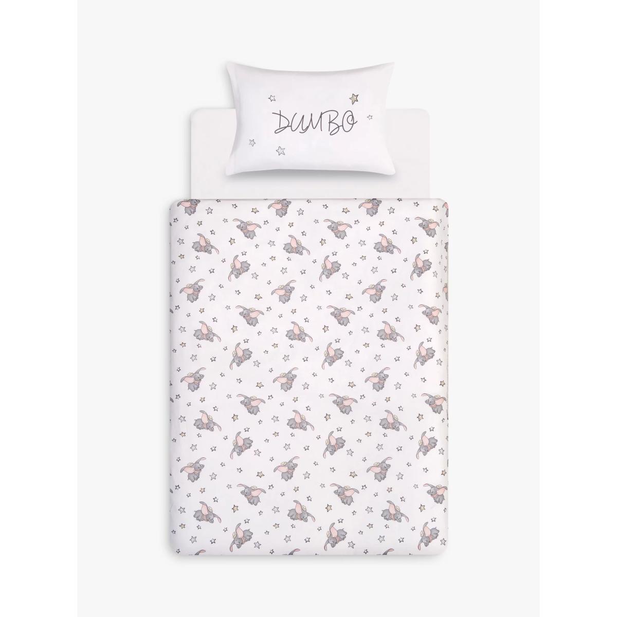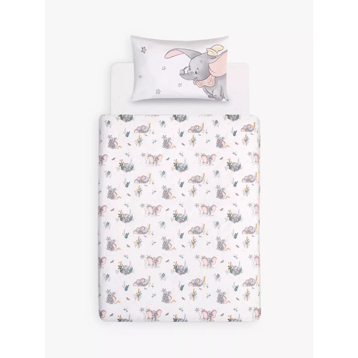 With a reversible design, both of which feature Dumbo in all his glory, this set is a great choice for fans of the classic tale. Little Dumbo plays among meadow foliage on one side of this charming Disney duvet cover set while the soft tonal reverse print is a small-scale pretty Dumbo allover print, giving an alternative look to the bedroom interior. Made from pure cotton that's gentle on young skin, the set comes with a matching pillowcase that completes the look. Good to know: The cot, cotbed and single sets come with one standard pillowcase and the double set comes with two standard pillowcases. To fit duvet/pillow size (cm) Standard pillowcase, L75 x W50cm Cot duvet cover, L100 x W120cm Cotbed duvet cover, L150 x W120cm Single duvet cover, L200 x W135cm Double duvet cover, L200 x W200cm Please remember: Quilts, duvets and pillows are not suitable for children under 12 months due to the risk of overheating.