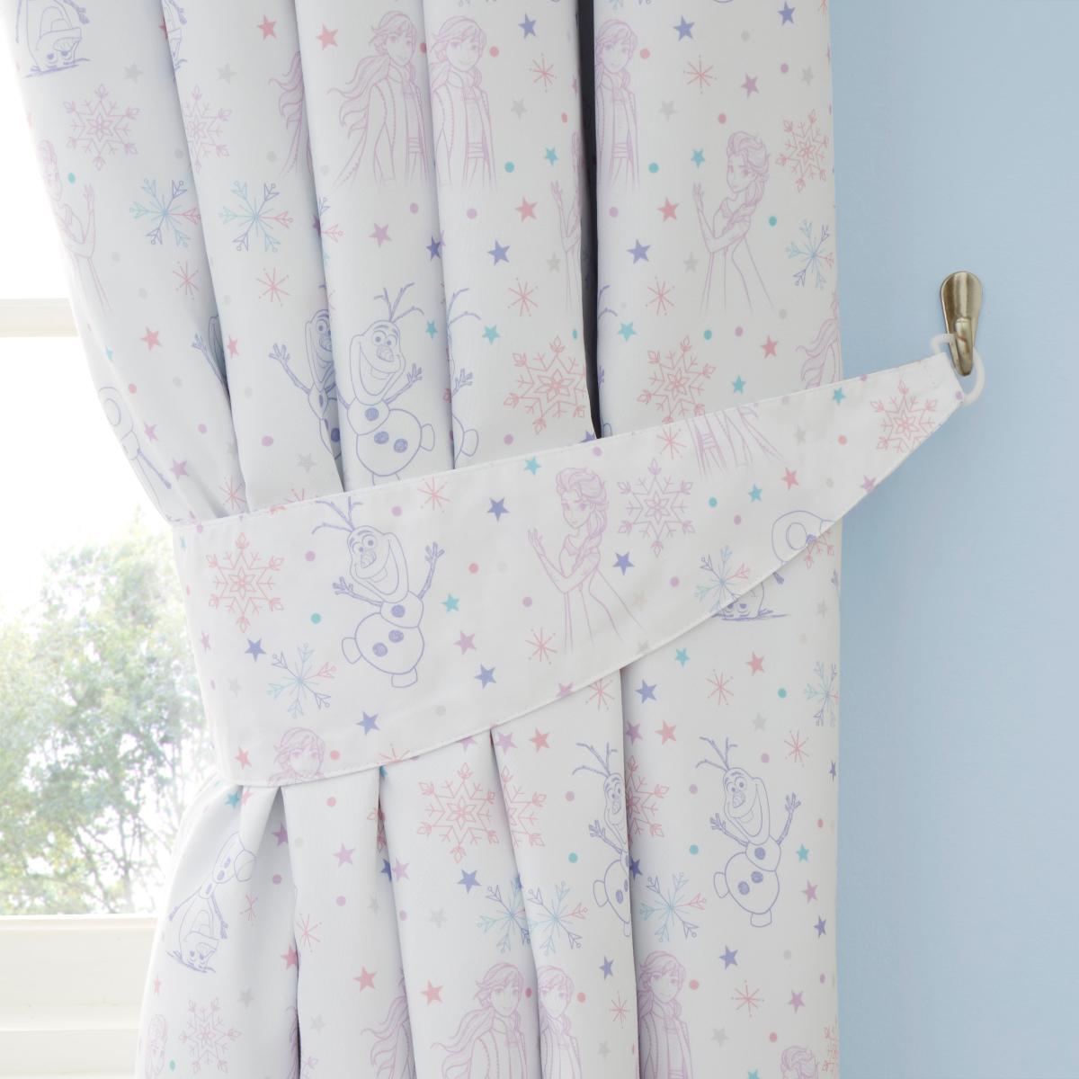 * Eyelet header* Blackout lining* Frozen design* Coordinating Tiebacks available Featuring some of your favourite Frozen characters, this pair of eyelet curtains is a fun way to finish off your little one's bedroom. Designed with all the Frozen characters from Olaf to Elsa and Anna with pretty stars to finish off. These curtains feature a blackout lining, reducing unwanted light giving your little one an uninterrupted and dreamy night sleep. Crafted from soft polyester material which can be dry cleaned. Don't 'let it go', add it to your basket right away! This collection is verified by OEKO-TEX and independently tested for harmful substances as well as manufactured using sustainable processes under socially responsible working conditions.