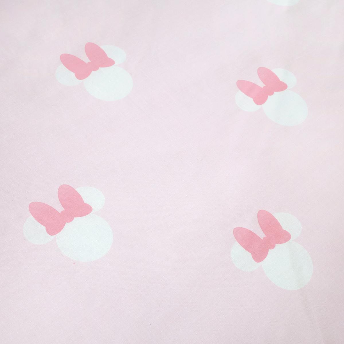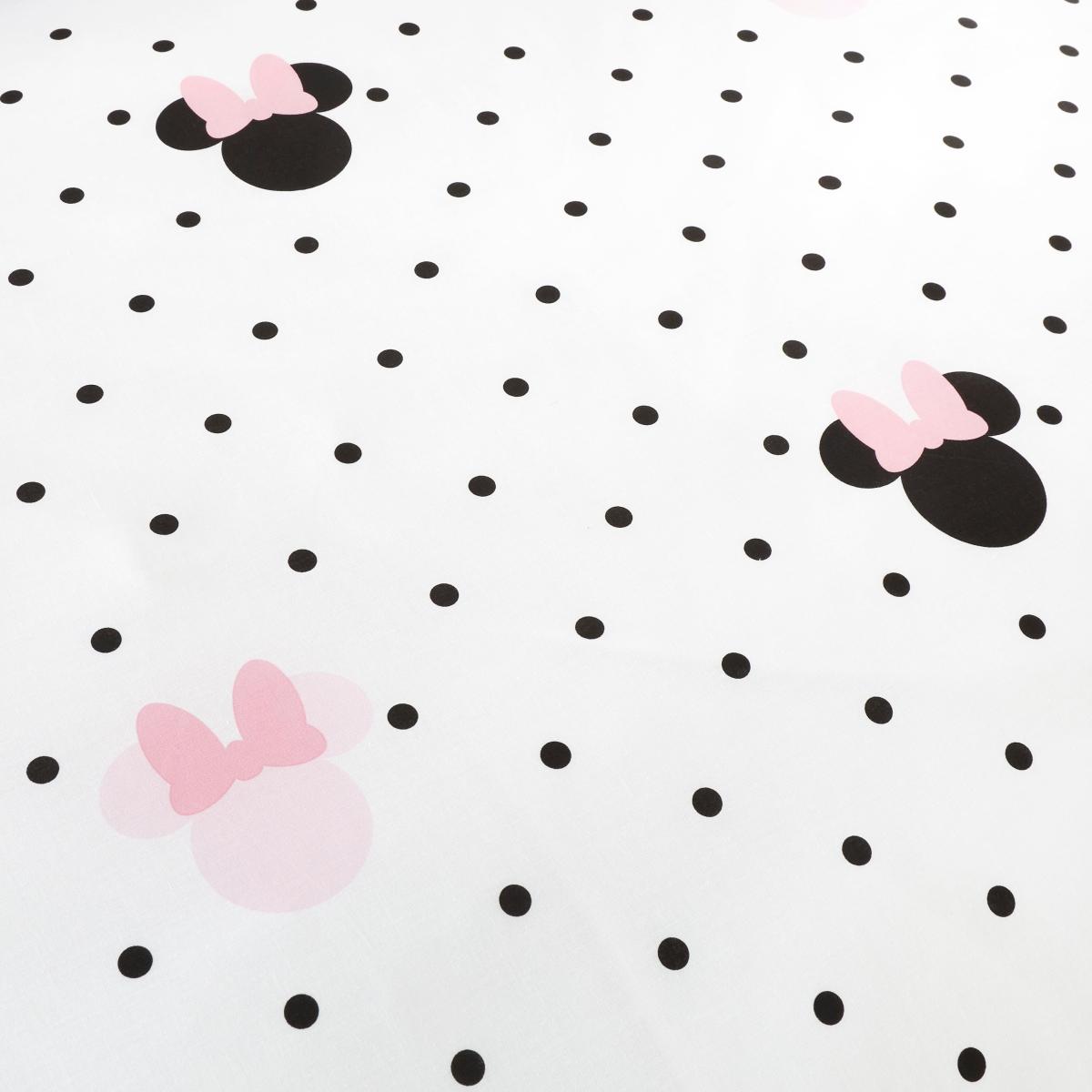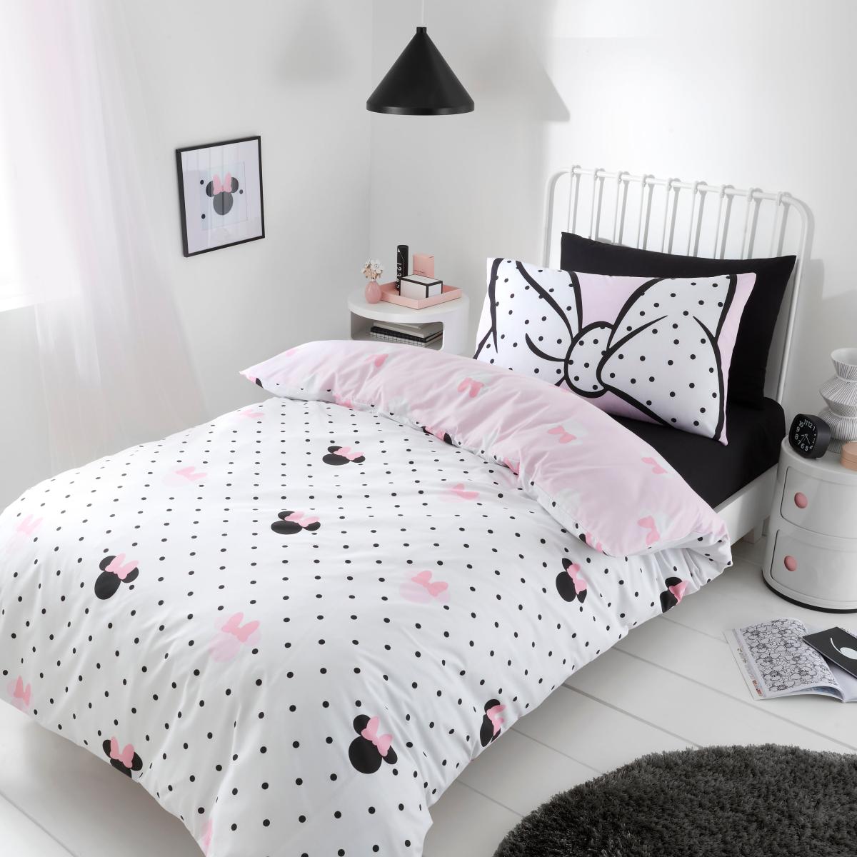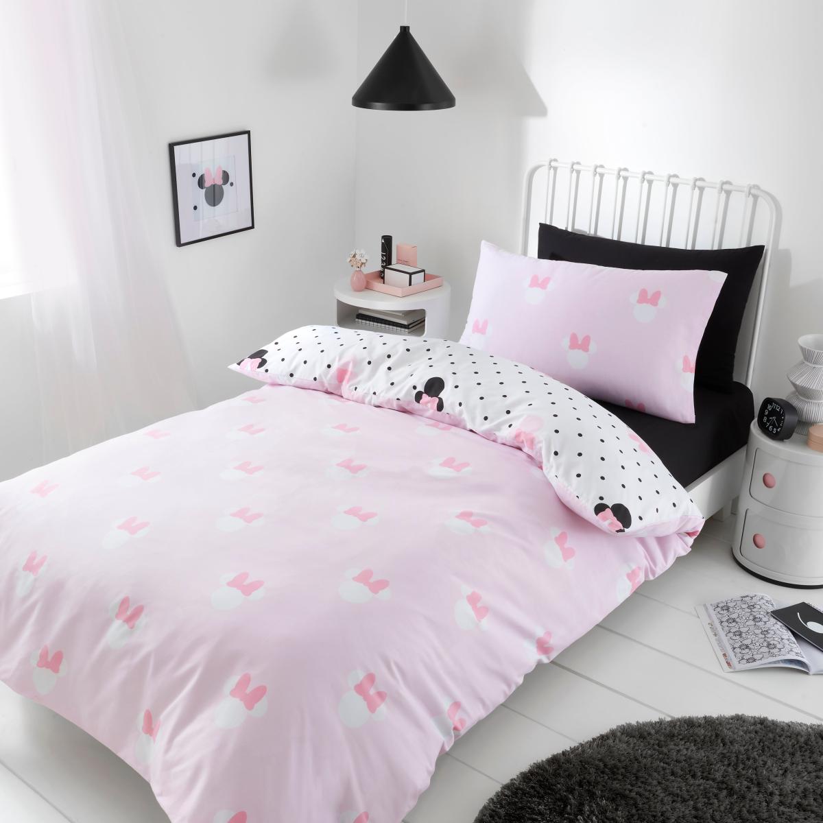 * Made from soft polycotton* Includes standard pillowcase(s)* Minnie Mouse print* Reversible design* Machine washable Perfect for your Minnie Me, this Minnie Mouse duvet cover and pillowcase set features a pretty black and white polka dot print with Minnie Mouse head shapes on one side and a Minnie Mouse head shaped print on the reverse on a baby pink background, making this bedding set interchangeable for quick style whenever they desire. Crafted from a soft blend of polyester and cotton material, this set is easy to care for and is fully machine washable. The duvet cover set has been finished with a secure button closure which helps secure the cover around the duvet whilst in use and includes a matching reversible pillowcase(s) for a complete look. This product is OEKO-TEX MADE IN GREEN certified, meaning it was produced in OEKO-TEX S Te P certified factories - verifying environmental, social, and chemical standards in the facility. It has also been certified to OEKO-TEX STANDARD 100, the original safety standard for everyday confidence. To offer full visibility, the production stages throughout the supply chain can be traced.
