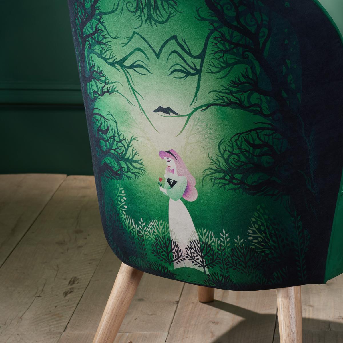 This distinctive Sleeping Beauty accent chair has a classic design with a contemporary twist that will sit well in a variety of living spaces. This occasional chair features a pleated back featuring the icon princess Aurora as well as her evil nemesis Maleficent. The maximum weight load for this chair is 110kg.