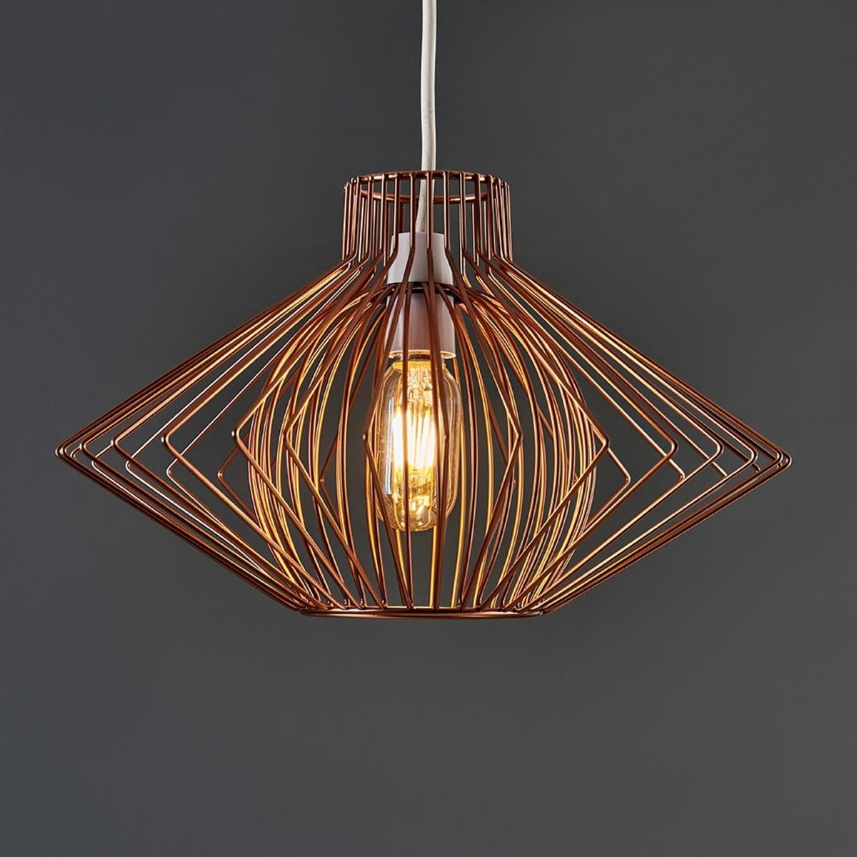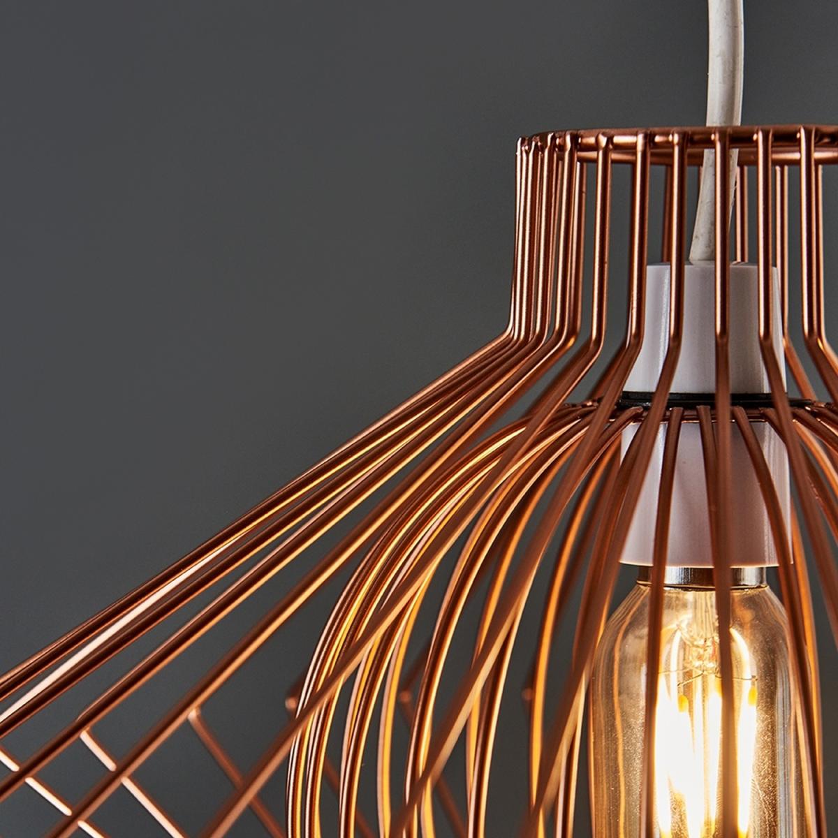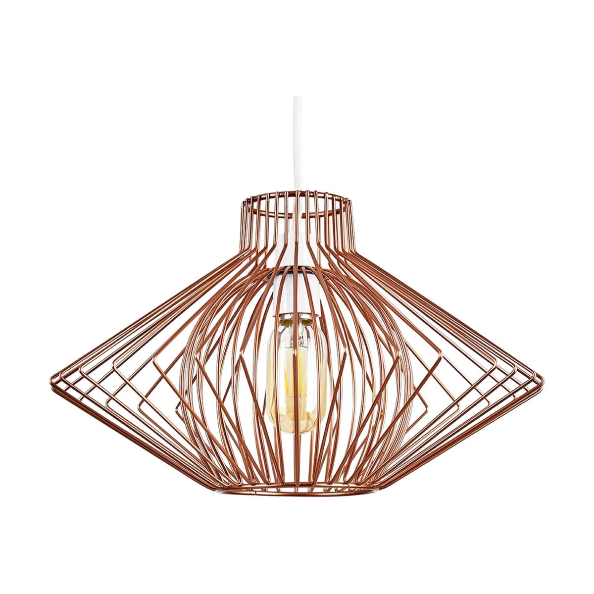 Retro style wire basket cage light shade in a gloss copper metal finish. This unique pendant shade features a disperse geometric design, creating a real style statement in any living area. The modern exposed bulb design allows for the light to disperse effectively and evenly throughout the room. Ideal for lounges, dining rooms, bedrooms and hallways.