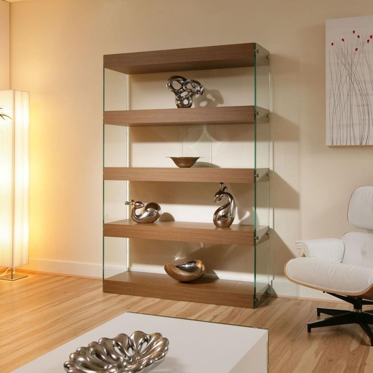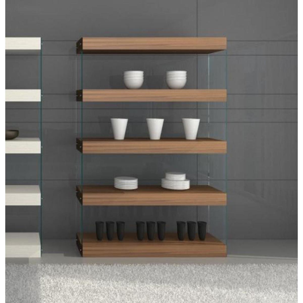 Display Cabinet / Shelving Walnut & Glass Modern Parker. Features 4 thick (100mm) shelves and glass end panels. Wonderful build quality. W125cm D38cm H183cm Modern Design Premium Quality Furniture