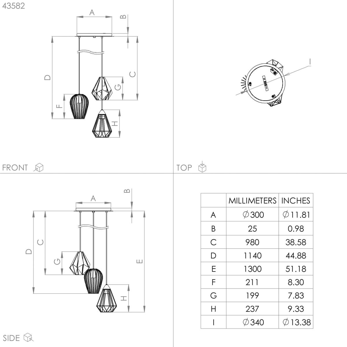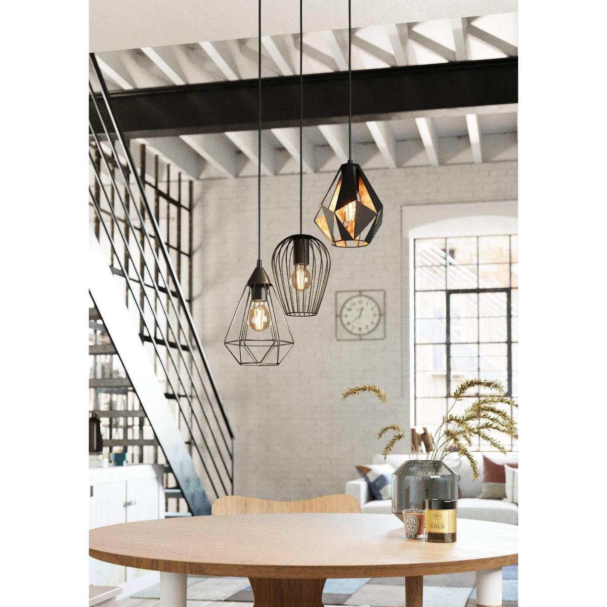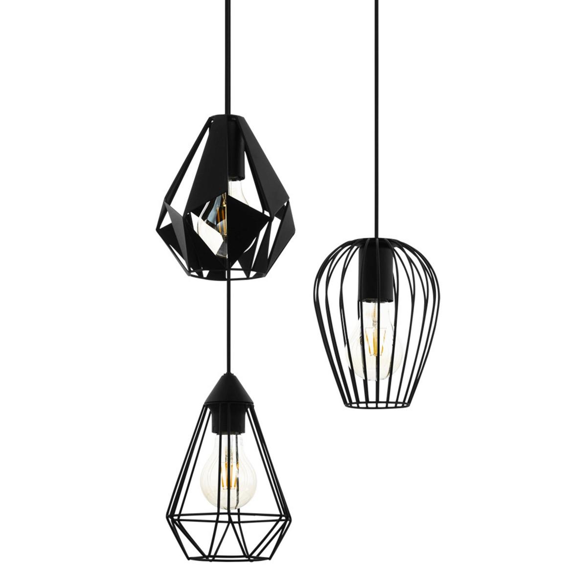 The Distaff pendant light features three black metal shades in various geometric designs. The shades are suspended at different heights from the circular black metal canopy. The cut-out design on the lampshades creates a fascinating play of light and shadow on the wall. The pendant light complements modern interiors and works well in any space, whether in the living room or above the table in the dining room. The pictured filament lightbulbs are not included. The product has E27 lamp holders and requires 3 x E27 lightbulbs.