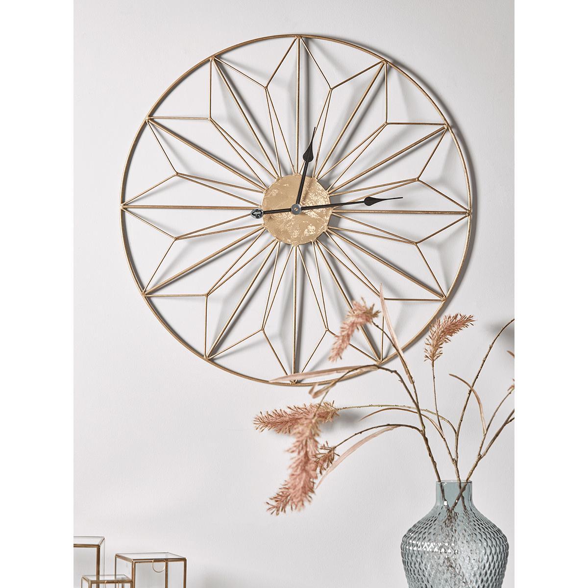 I love this wall clock for its bold yet refined geometric design and distressed brass finish, which adds a touch of vintage industrial charm. It works particularly well in contemporary, minimalist, or eclectic interiors where statement pieces are key. Practical styling tips include placing it above a neutral sideboard or in a living room corner for visual interest, and pairing with other brass accents or textured ceramics to create a cohesive look. Its open framework makes it versatile, so it can complement both wall colours and patterned backgrounds without overwhelming the space.