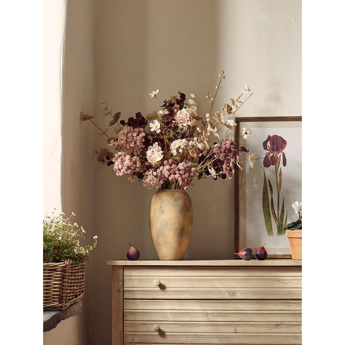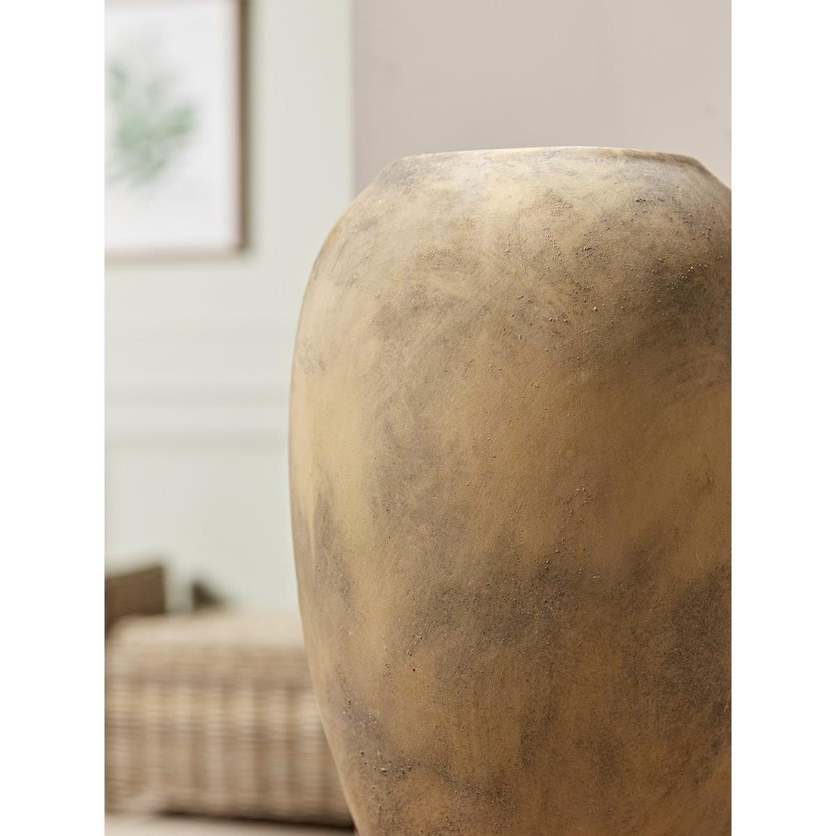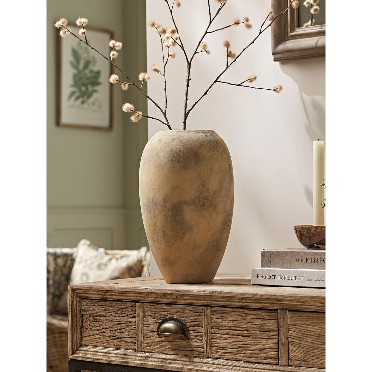 Simple lines work to create a vase that is tall in stature for a sense of grandeur, with curvaceous edges that add a softeness to the design. In neutral tones with a distressed finish, this vase is perfect for a neutral and minimalist interior style.  Perfect for taller stems, place some faux flowers in it and add a fresh and bright atmosphere to your home.