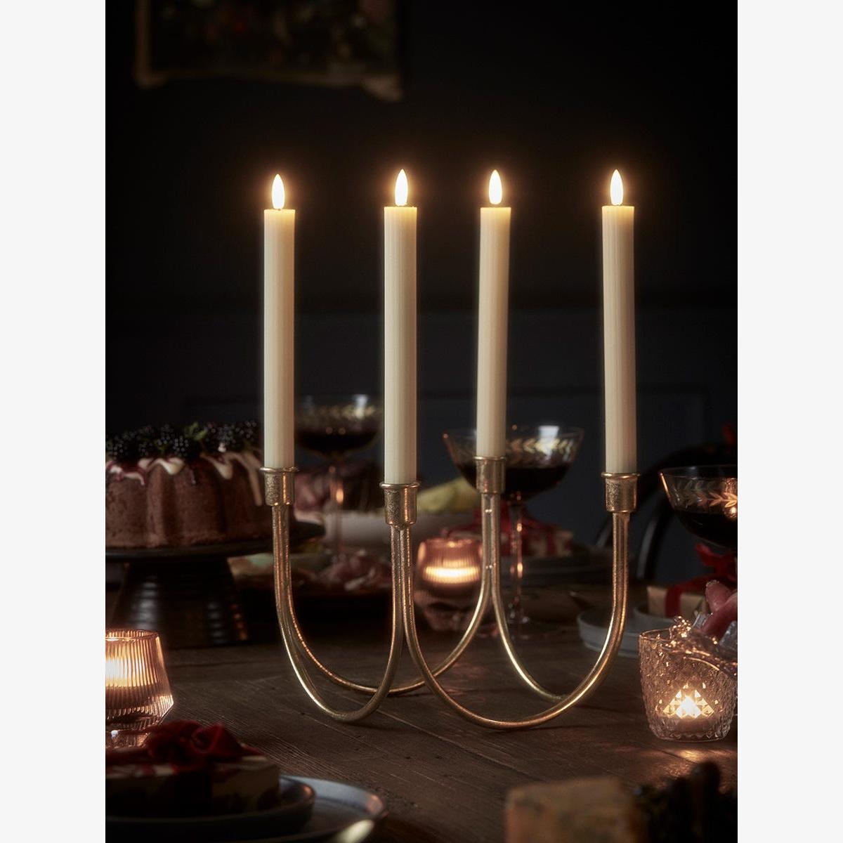 A Christmas candle holder that makes a simple but elegant statement in richly burnished golden tones. With a lightly distressed finish, the metal candle holder features swooping curves and has holders for four dinner candles. Pair with our Fluted LED Dinner Candles for fuss free table centres. Discover more of our Opulent Christmas trend.