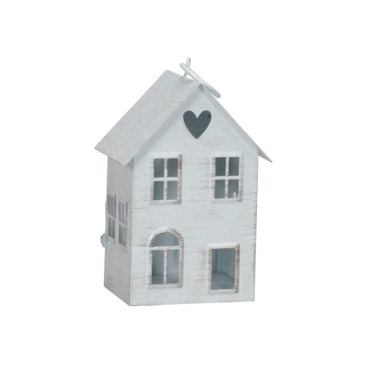 A small distressed house shaped lantern with cut out windows, heart detail and loop handle. So pretty item that would add charm to any decor whether inside or outside. Place on shelves and add a tea light or led light.
