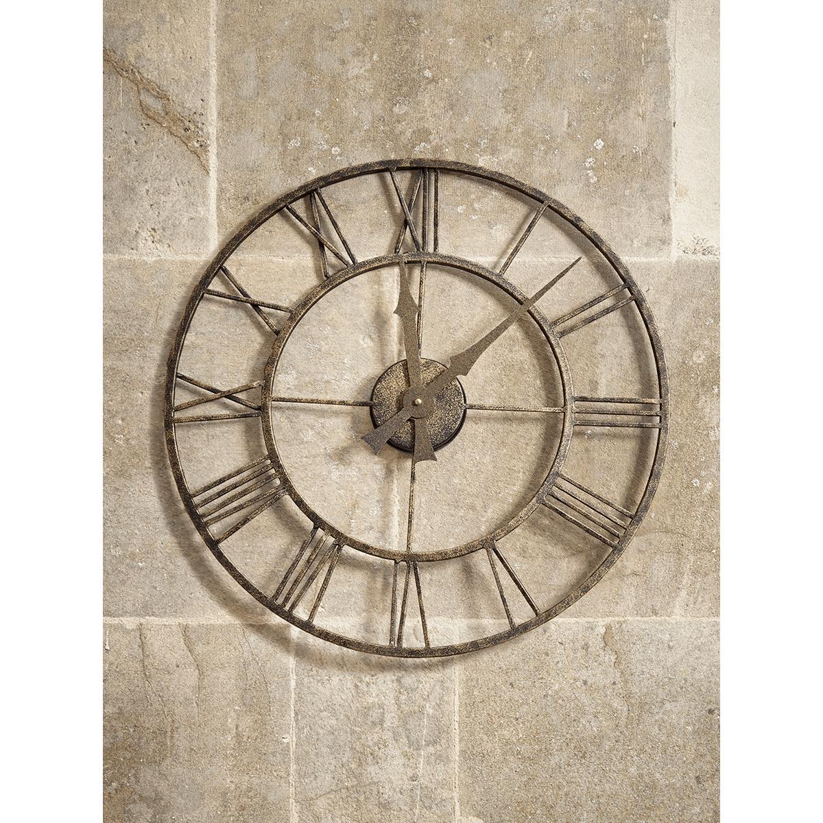 Suitable for both indoor and outdoor use, our skeleton clock has a rustic aged metal iron frame with a distressed gold effect finish. Each weighty clock has roman numerals set around elegant metal hands that have a smooth and silent tick. With two keyhole hooks on the reverse for hanging, this large clock makes a standout accessory for your garden wall or indoor living space.