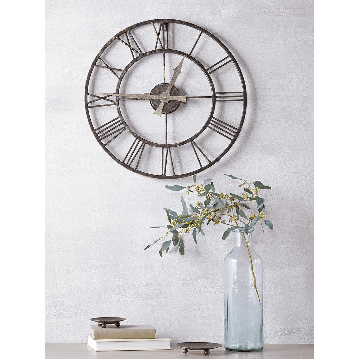 I love how this distressed clock adds an industrial charm to a space, making it versatile for both contemporary and rustic interiors. It works particularly well in open-plan kitchens, living rooms, or outdoor patios where it can serve as a statement piece. To style it effectively, consider pairing with natural materials like wood and metal accents, and keep other accessories minimal to let the clock stand out. Its medium size makes it a great focal point without overwhelming the wall, and the distressed finish adds character, giving your space a lived-in, timeless feel.