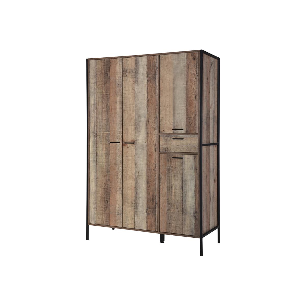 Functional and fashionable, this wardrobe features double doors, two cupboards with shelves and one drawer. Crafted from beautiful, distressed oak with contrasting sleek black handles and legs, it's suitable for any interior.