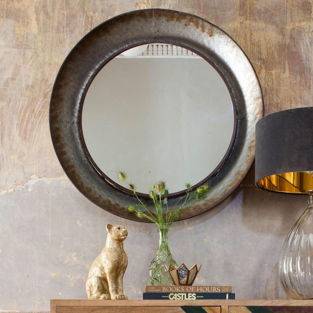 A substantial round rustic mirror made of iron metal with a distressed rust finish.